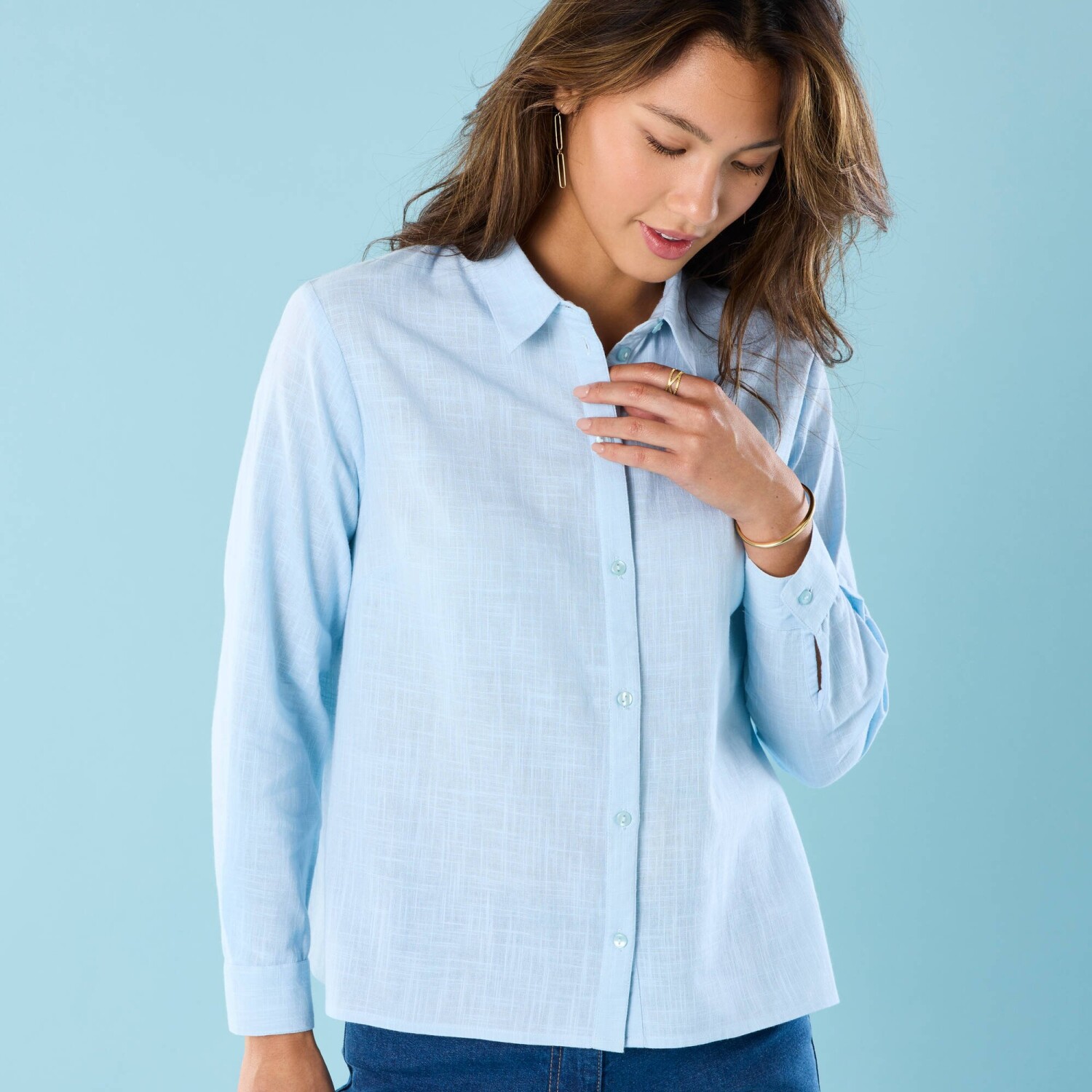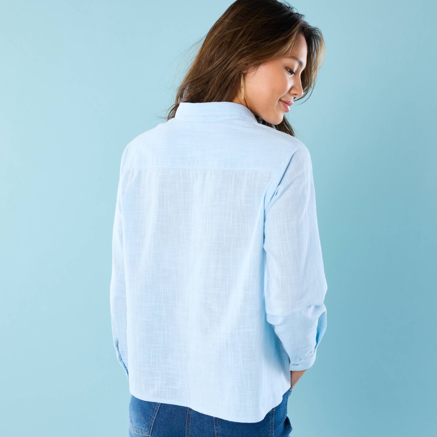 Monochromatyczna koszula o lnianym wyglądzie została specjalnie zaprojektowana dla mniejszej sylwetki. Efekt lnianego materiału. Kołnierzyk koszuli. Zapięcie z przodu na guziki. Tylne rozcięcie na ramieniu. Lekko opadające ramiona. Długie rękawy. Mankiety zapinane na guziki. Prosty dół. Można prać w pralce.