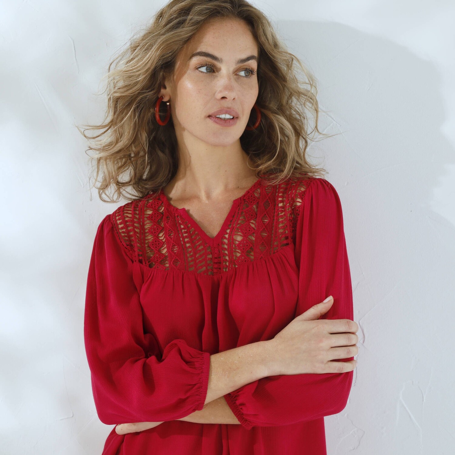 Bluzka koszulowa z nadrukiem! Uszyta z lekkiego woalu z odrobiną połysku. Okrągły dekolt z owalem i dekoltem w serek + sznurek do ściągania. Krótkie rękawy z rozcięciem na ramieniu. Prosty dół. Do noszenia na podkoszulek, aby uzyskać efekt prześwitywania. Można prać w pralce.