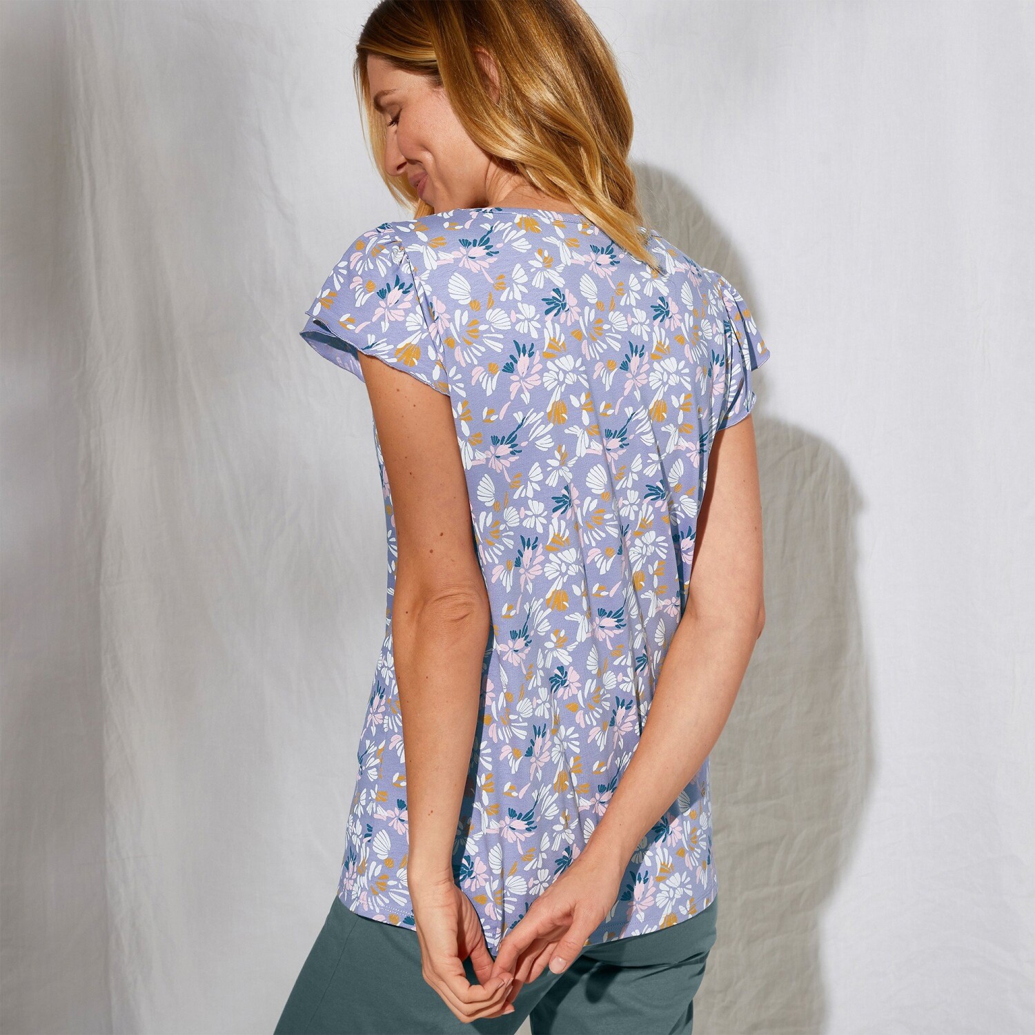 Zainspiruj się kolekcją nadruków petal i zwróć uwagę na drukowaną koszulę od piżamy z krótkim rękawem. Ekskluzywny nadruk Blancheporte. Zaokrąglony dekolt V. Marszczone ramiona. Krótkie marszczone rękawy. Prosty dół. Oeko-Tex standard 100 (nr CQ 1216/3). Znak ten oznacza produkty tekstylne, które zostały poddane testom laboratoryjnym pod kątem szerokiej gamy szkodliwych substancji, a produkt jest bezpieczny ponad obowiązujące normy. Można prać w pralce.