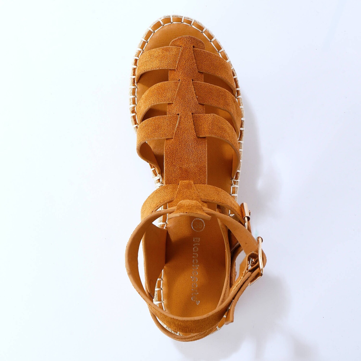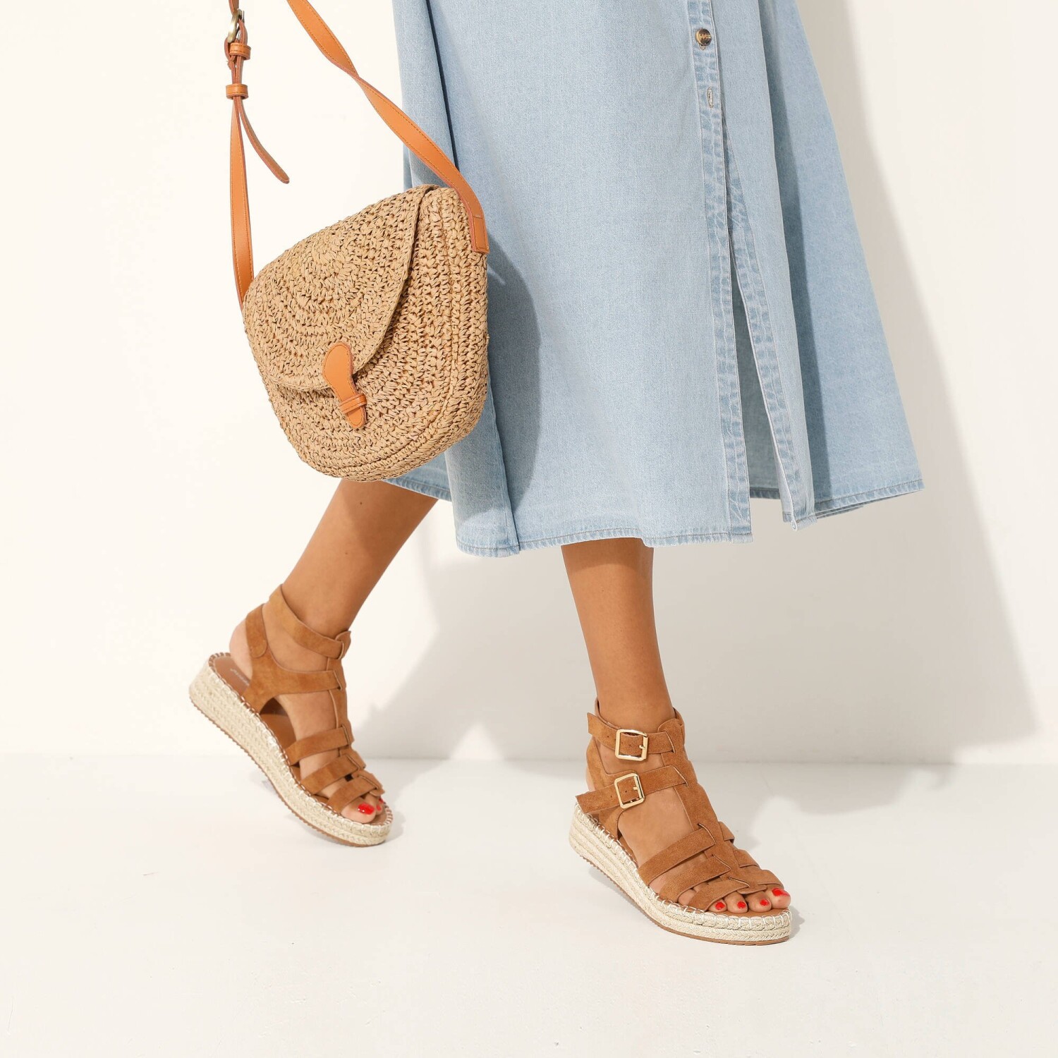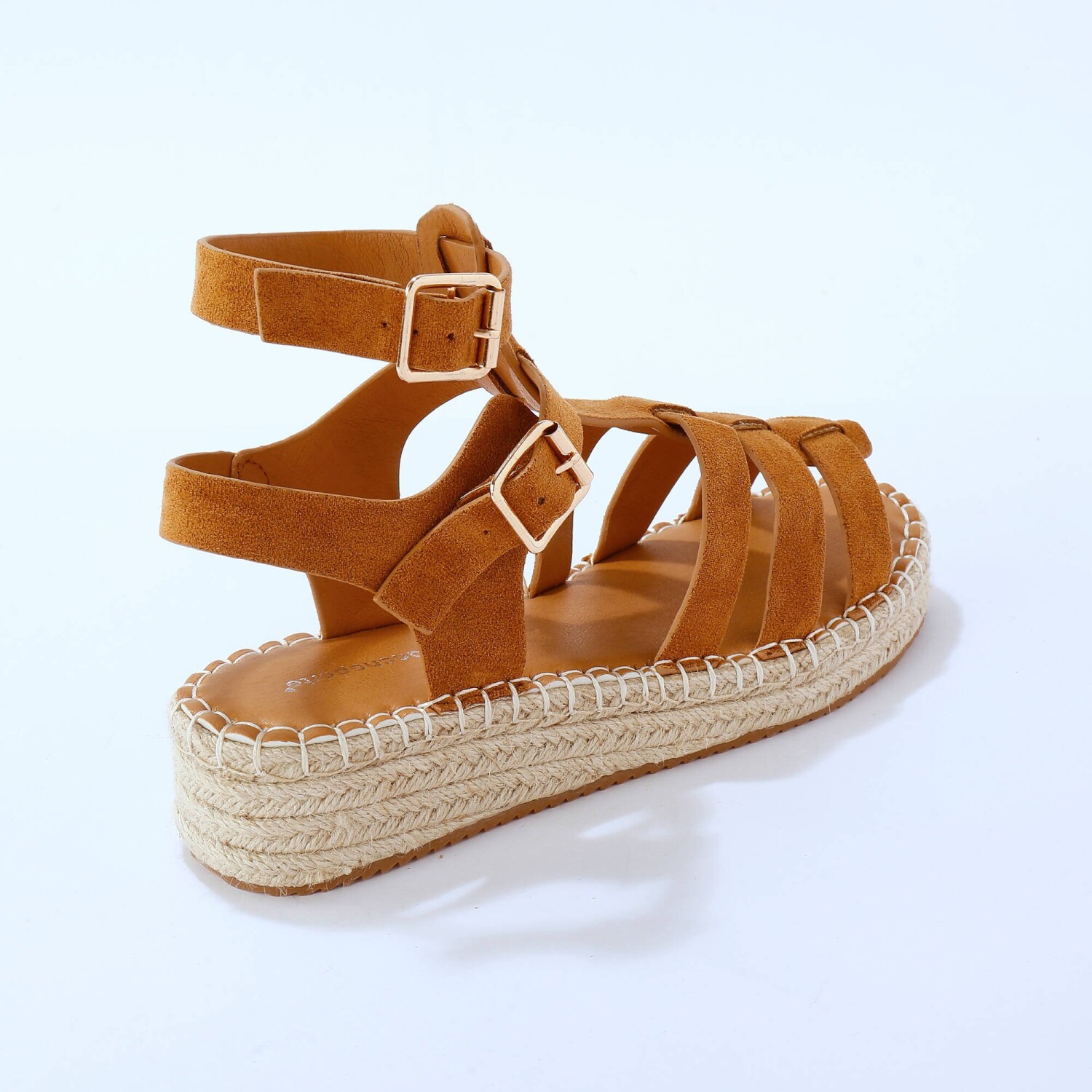 Sandały ze sznurowaniem wokół kostki z łatwością poradzą sobie z optycznym wydłużeniem sylwetki. Na klinowym obcasie. Sznurowane wokół kostki wykończone frędzlami, odpowiednie dla każdej sylwetki. Zamszowa cholewka. Obcas o drewnianym wyglądzie.
