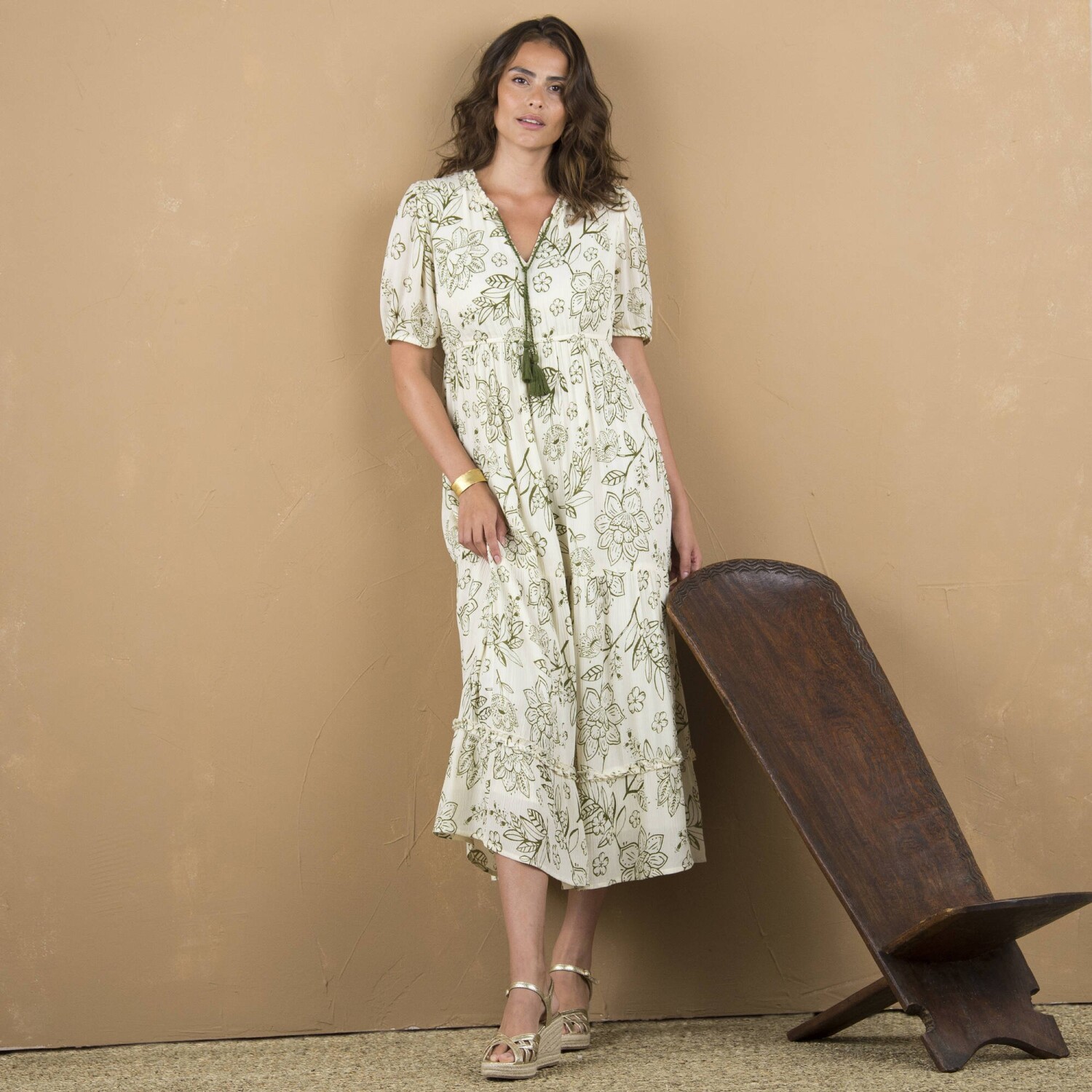 Wzbogać swoją letnią garderobę o piękną sukienkę midi z nadrukiem. Krój midi glamour. Okrągły dekolt z falbanką. Sznurek ściągający przy dekolcie z frędzlami. Elastyczny krój pod biustem. Balonowe elastyczne rękawy do łokci. 3 falbany pod wycięciem na piersi. Świeża krepa wygodna w noszeniu. Można prać w pralce.