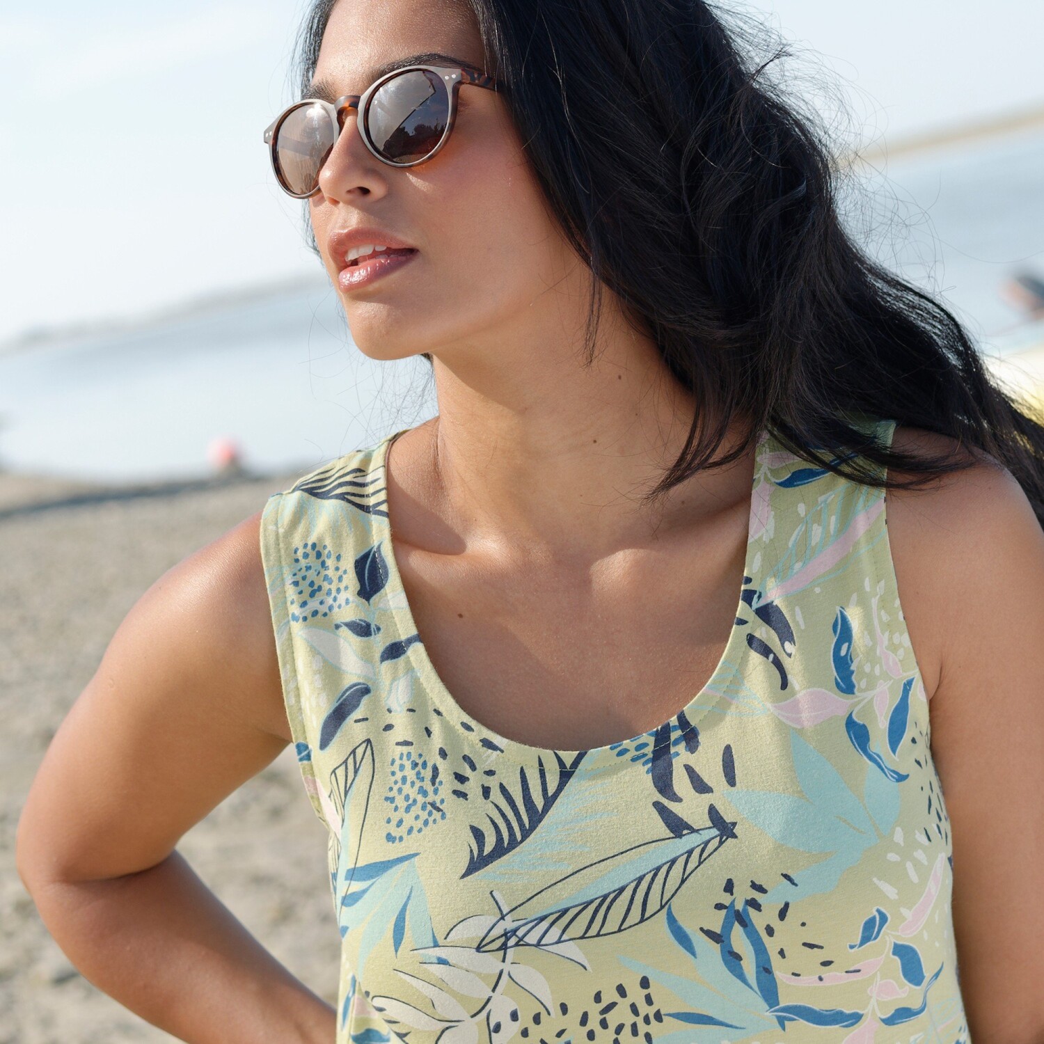 Top z nadrukiem i dekoltem w kształcie litery V na różne okazje. Oddychająca dzianina, łatwa w utrzymaniu. Dekolt w kształcie litery V wykończony makramą. Zapięcie na 3 guziki w kokosowym stylu. Prosty dół. Można prać w pralce.