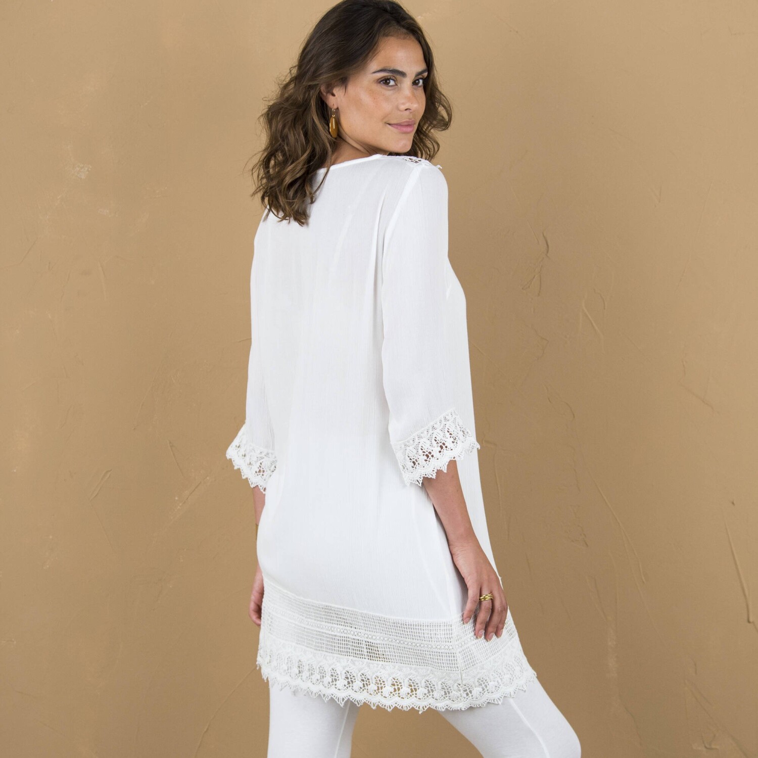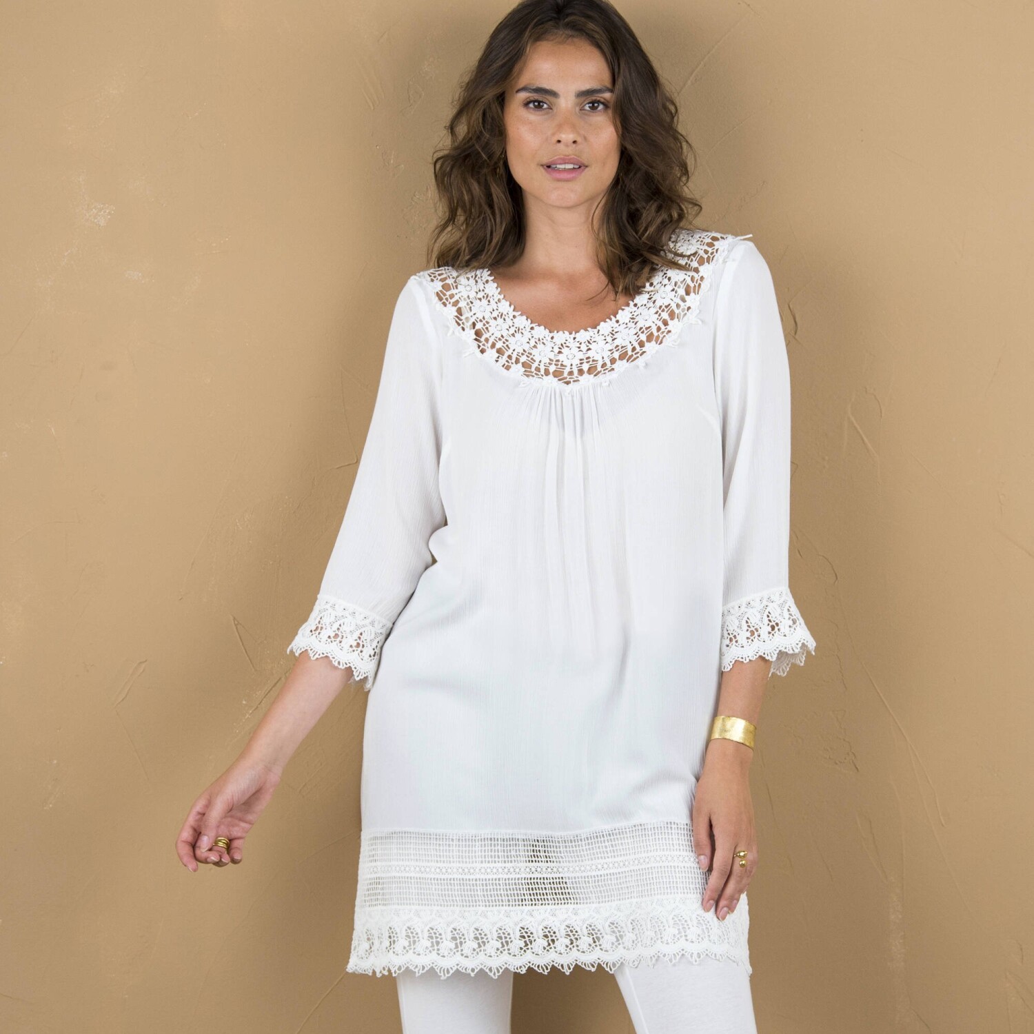 Tunika z kreponu z rękawami 3/4 i makramą