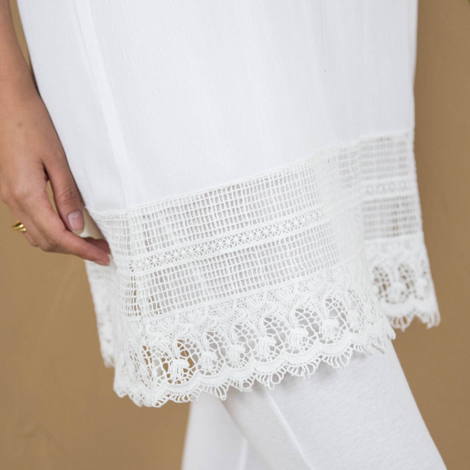 Długa tunika ma w sobie mnóstwo uroku! Okrągły dekolt z szerokim makramowym paskiem z przodu. Rozcięcia na piersi. Szeroki makramowy pasek u dołu i na końcach rękawów 3/4. Pochlebna długość odpowiednia do łączenia z legginsami. Łatwa w pielęgnacji krepa. Można prać w pralce.