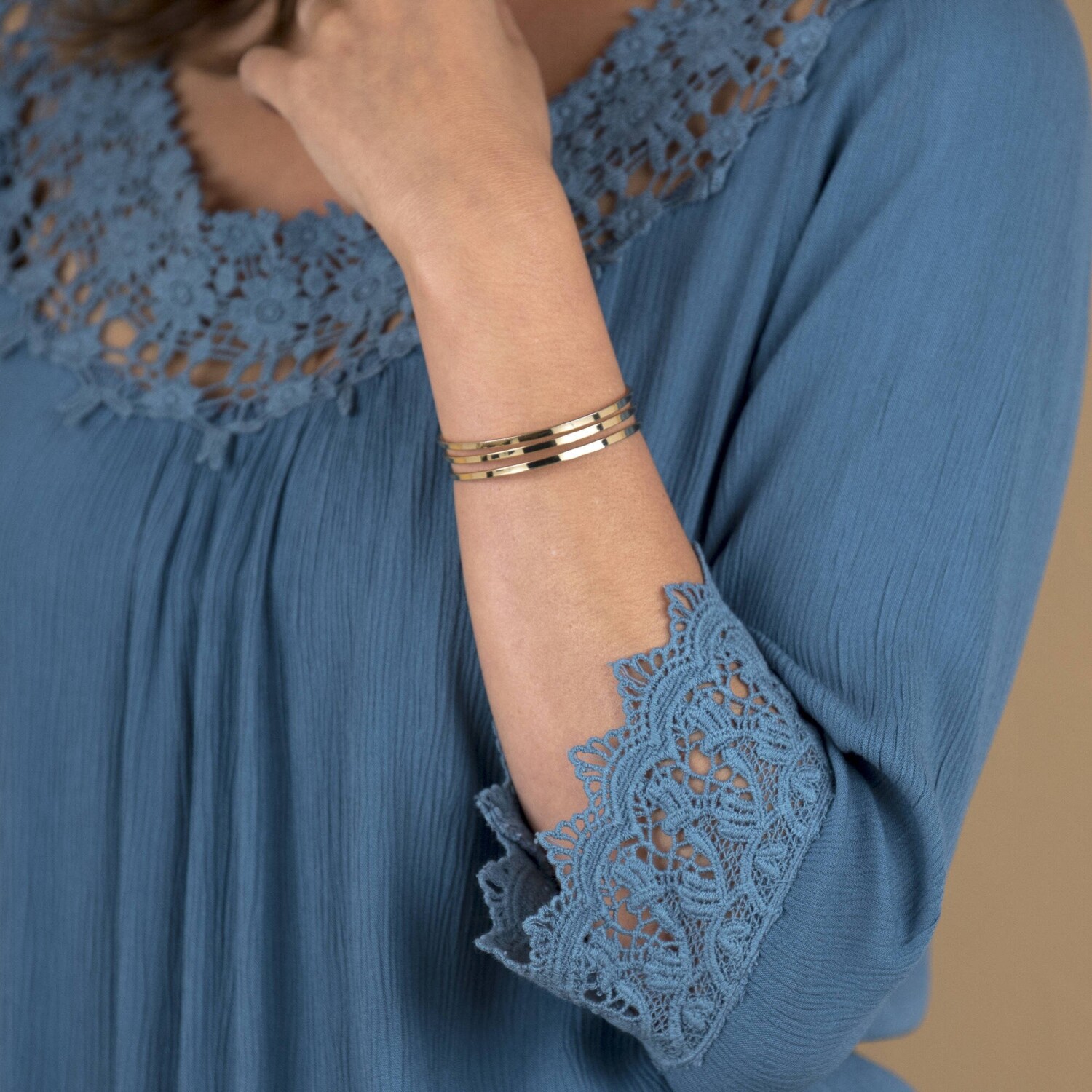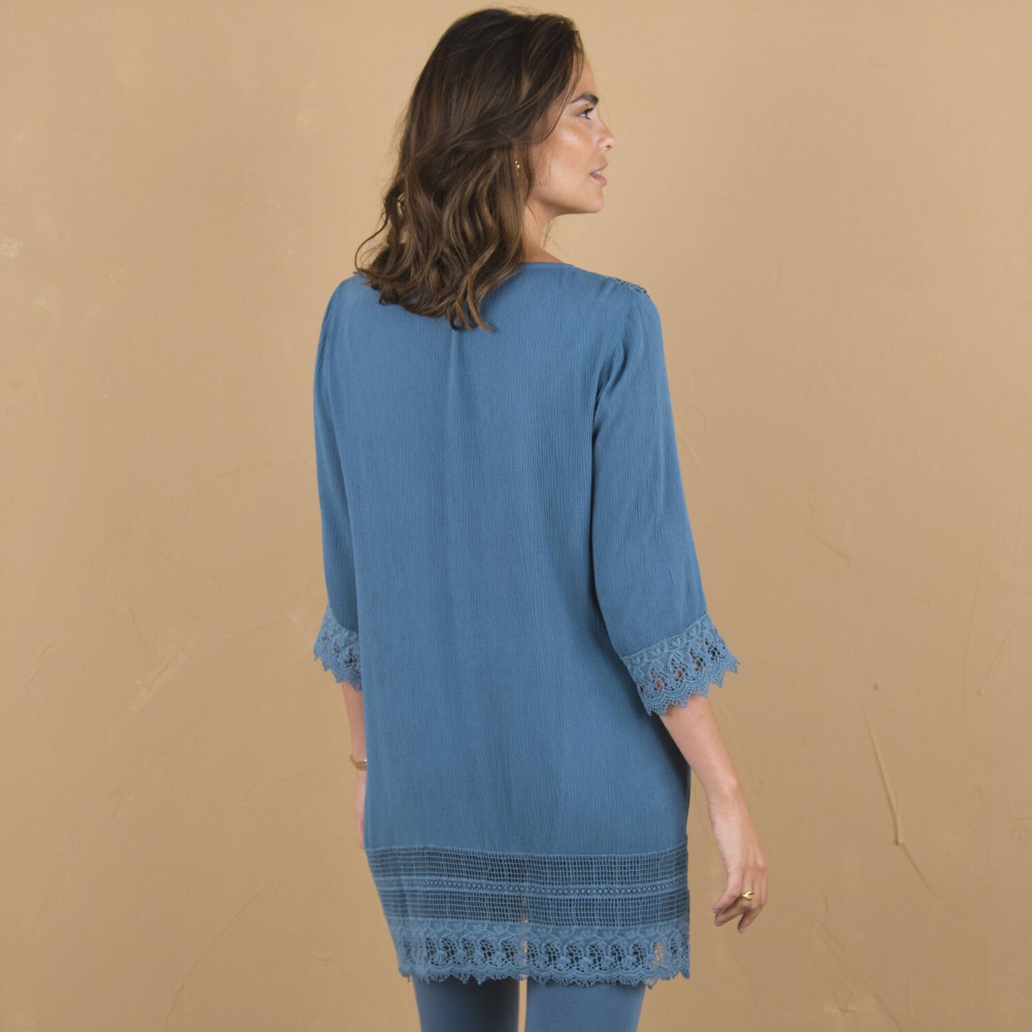 Długa tunika ma w sobie mnóstwo uroku! Okrągły dekolt z szerokim makramowym paskiem z przodu. Rozcięcia na piersi. Szeroki makramowy pasek u dołu i na końcach rękawów 3/4. Pochlebna długość odpowiednia do łączenia z legginsami. Łatwa w pielęgnacji krepa. Można prać w pralce.