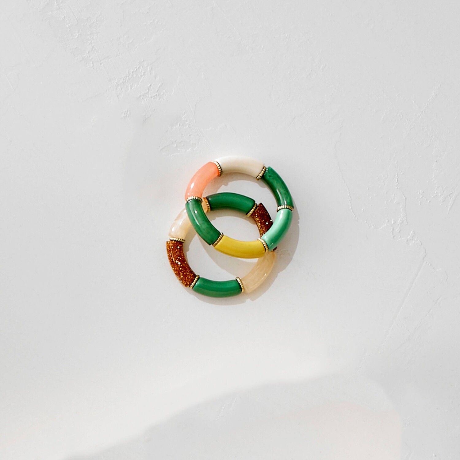 Letnia biżuteria, to bransoletka z koralików, którą oferujemy w zestawie 2 sztuk. 6 koralików rurkowych i 6 koralików w kolorze złotym. Elastyczna. Zestaw 2 sztuk.
