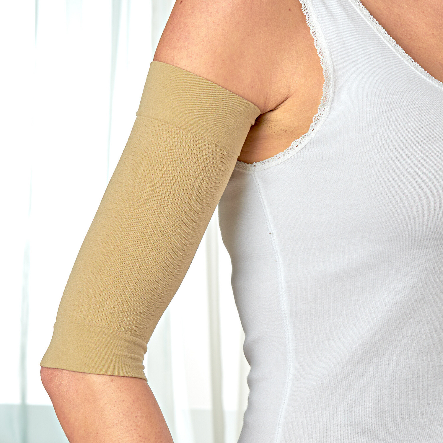 Szybkie rozwiązanie dla zwiotczałych ramion: wyprofilowane rękawy z delikatnym uciskiem ujędrniają i modelują ramiona. Może stymulować krążenie krwi i zmniejszać zmęczenie. Ramiona natychmiast stają się szczuplejsze i jędrniejsze. Przyjemnie miękkie i wygodne do noszenia pod ubraniem. Z lekkim uciskiem. Wysoka elastyczność. Stymulujące.