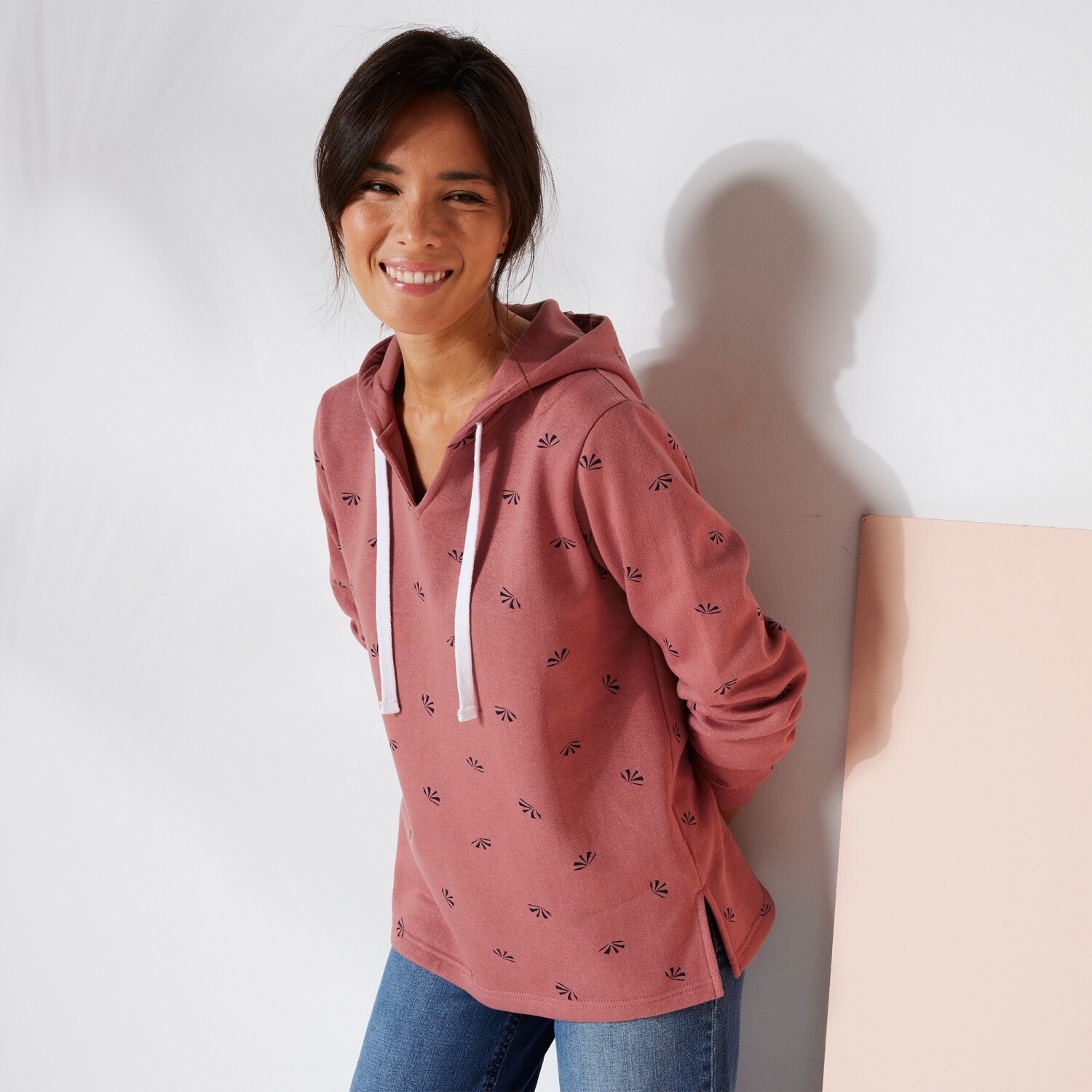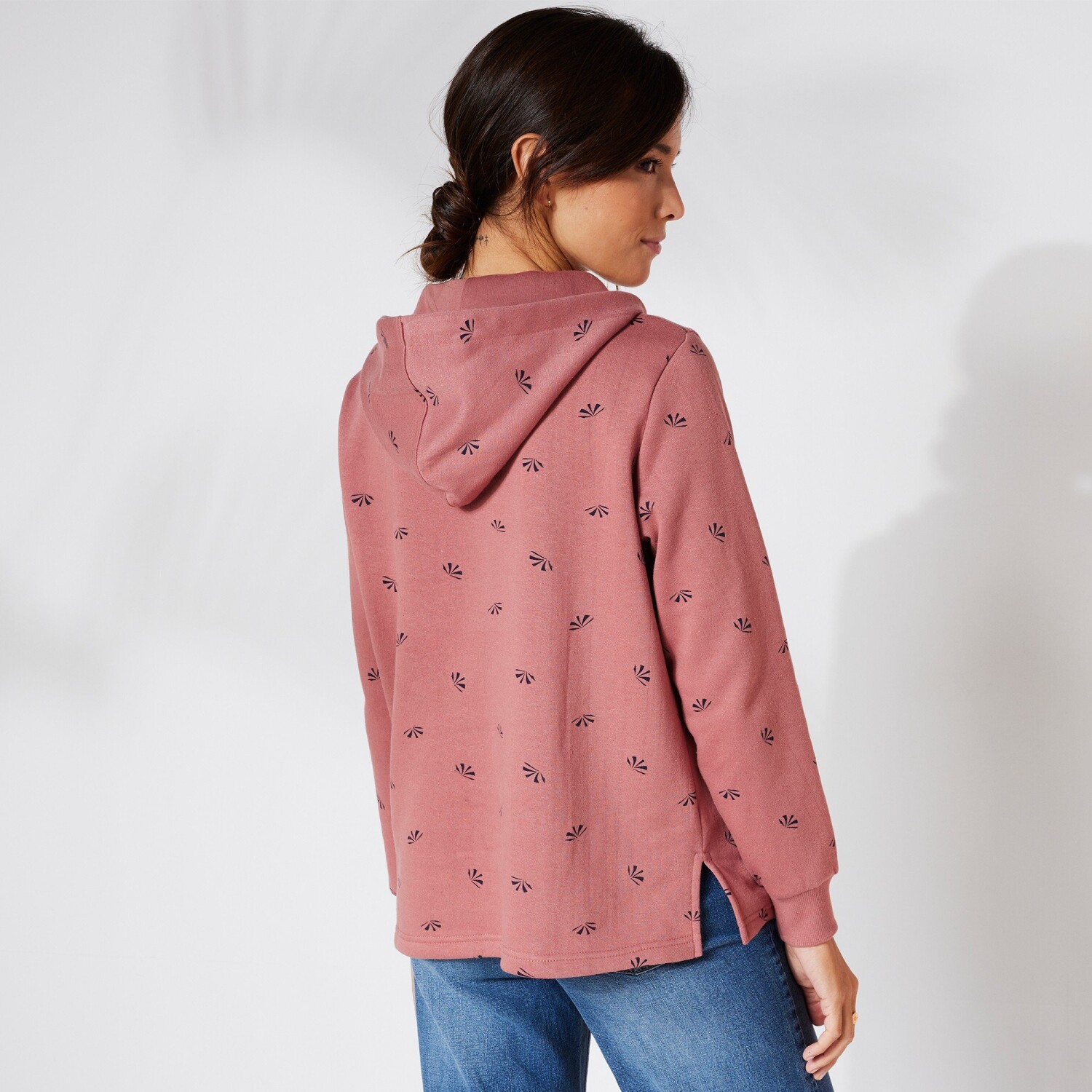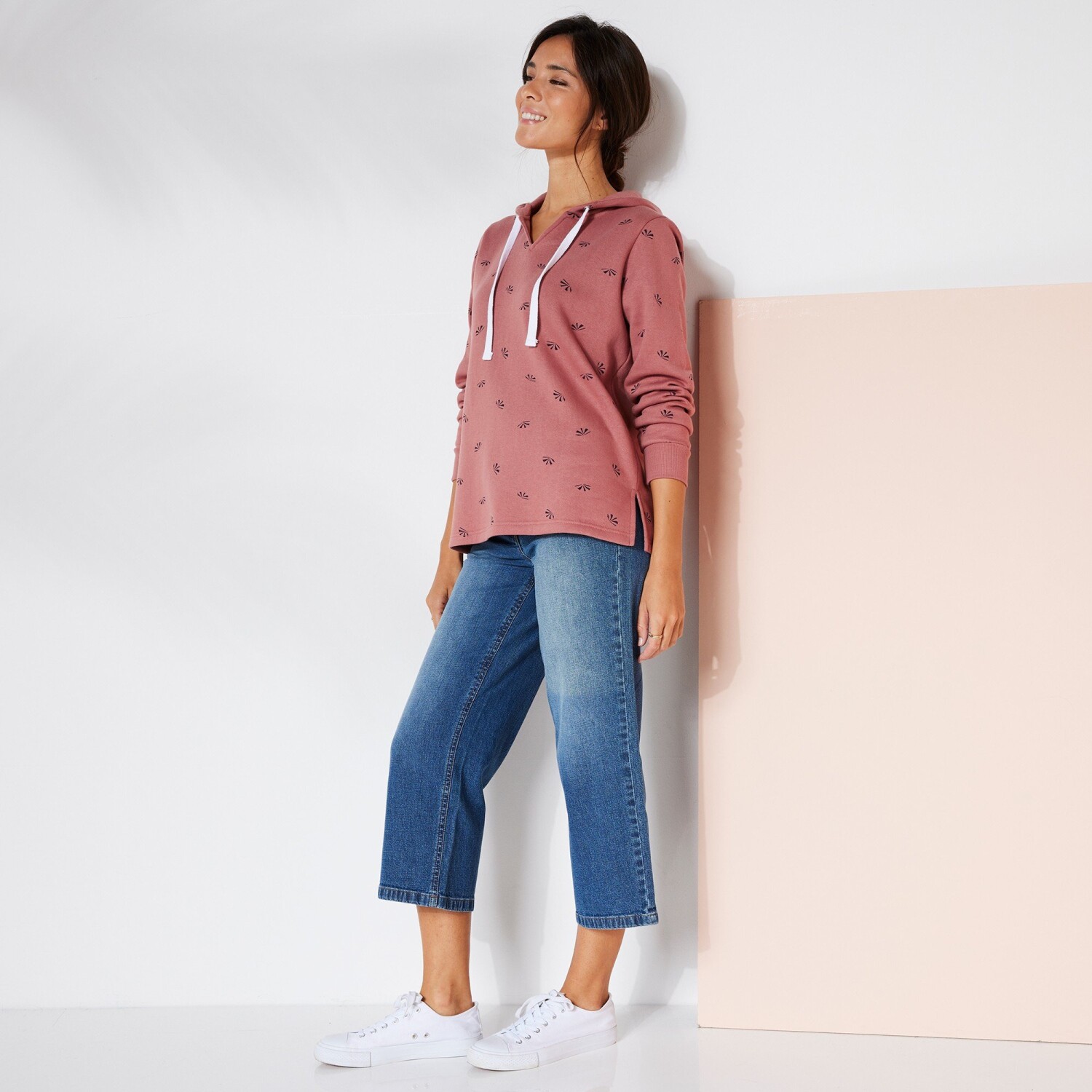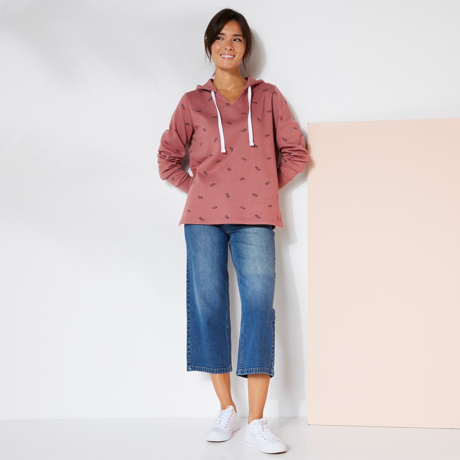 Oryginalna bluza z kapturem z nadrukiem jest miękka jak pieszczota. Długie rękawy ze ściągaczami. Pleciony sznurek i metalowe oczka na kapturze. Prosty dół z bocznymi otworami wentylacyjnymi. Prać w temperaturze 30°C.