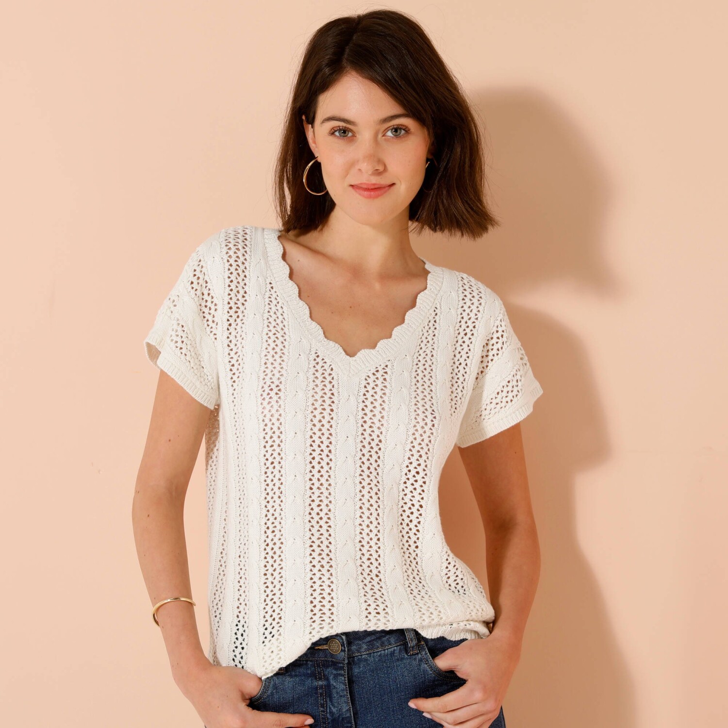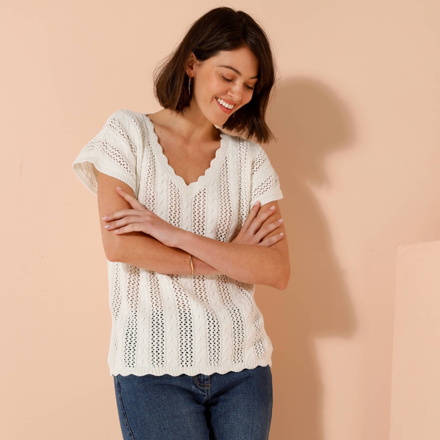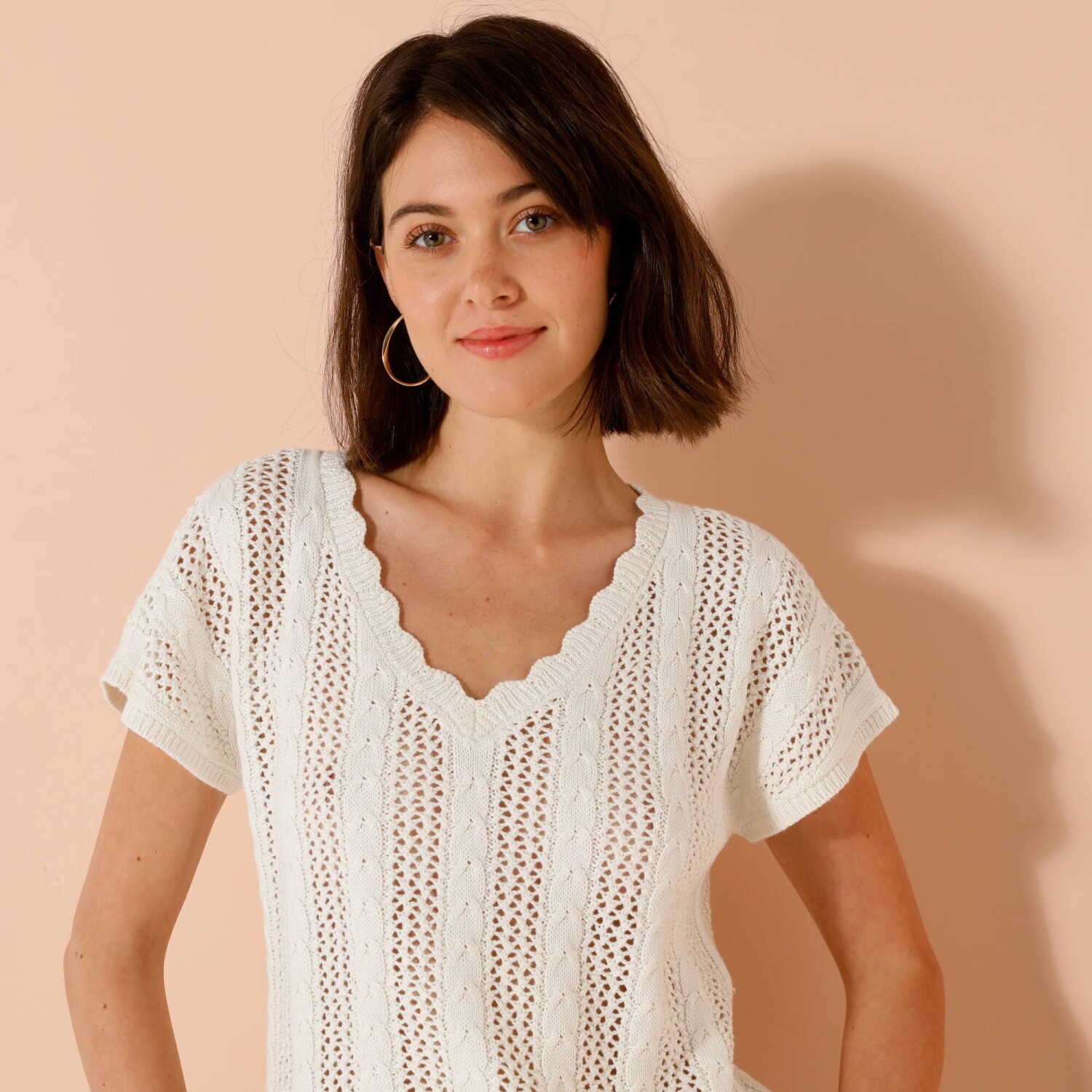 Marszczone rękawy, delikatny haft, uwodzicielski dekolt - tej modnej bluzce niczego nie brakuje. Zaokrąglony dekolt V. Zapięcie na guziki z przodu. Opuszczone ramiona wykończone falbaną. Marszczenia na piersi. Prosty dół. Można prać w pralce.