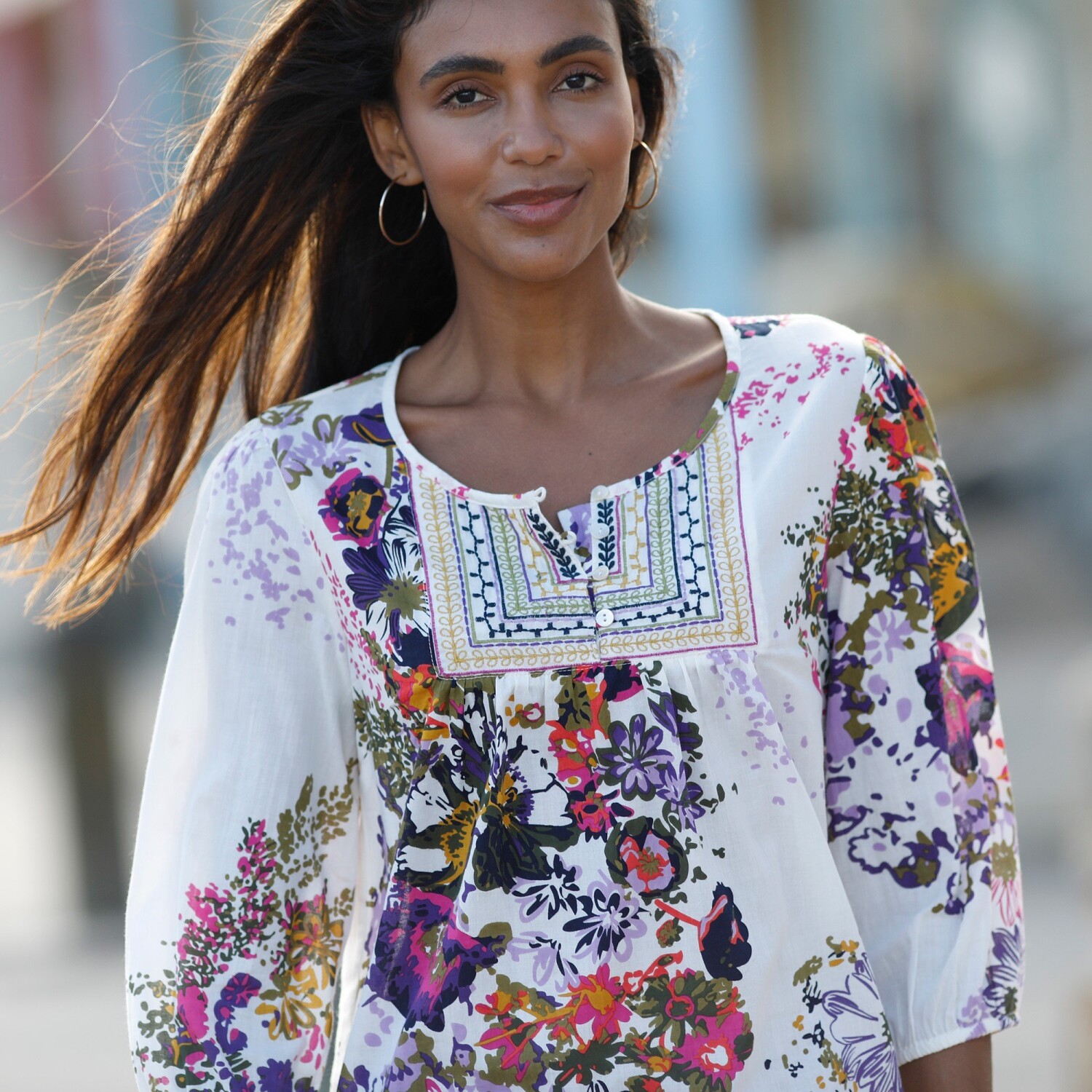 Świeżość i lekkość, taka jest ta bluzka w kwiaty! Idealnie luźny model, który przyciągnie wszystkie spojrzenia! Okrągły dekolt. Haftowany śliniak z rozcięciem i guzikami. Rękawy 3/4 z elastycznym dołem. Prosty dół. Można prać w pralce.