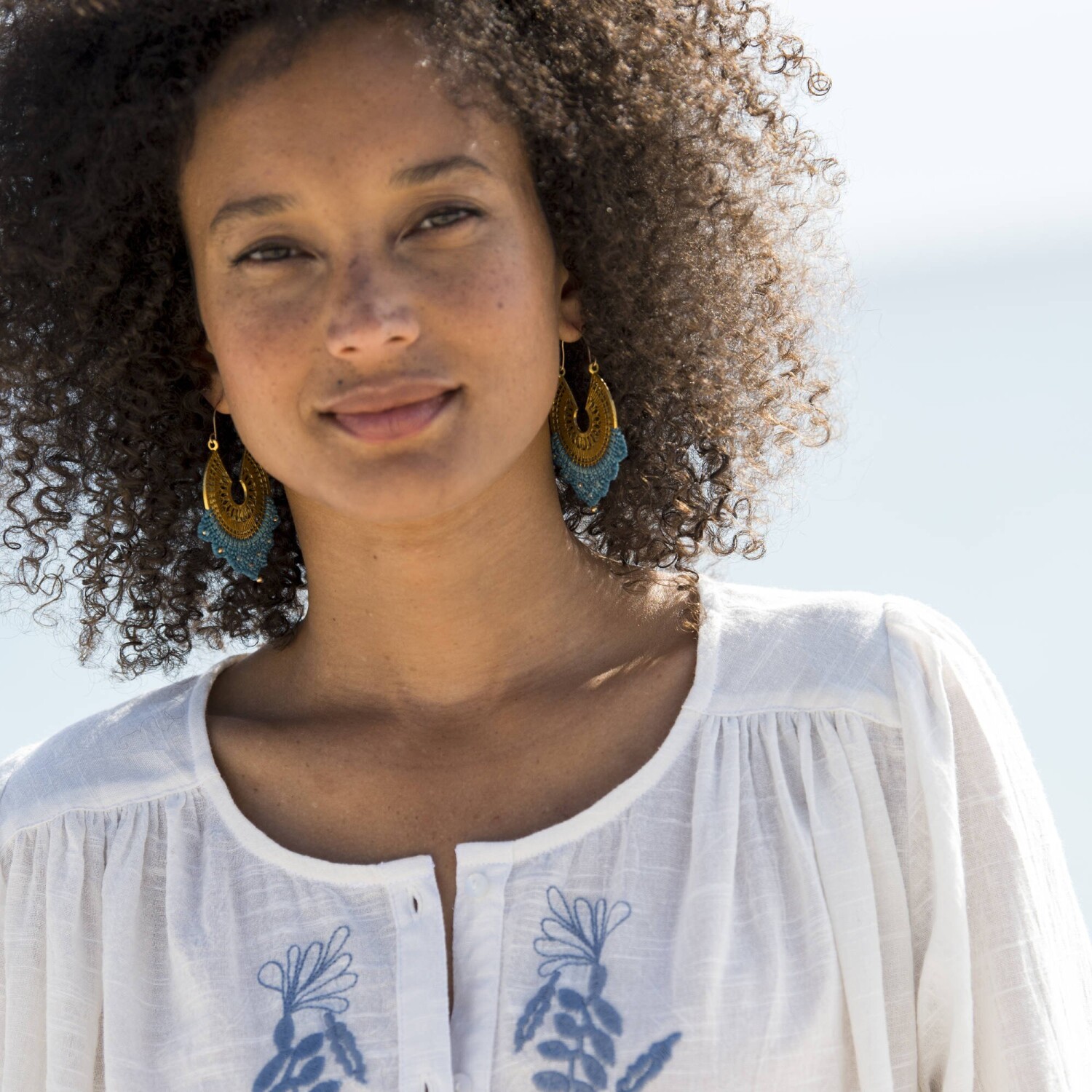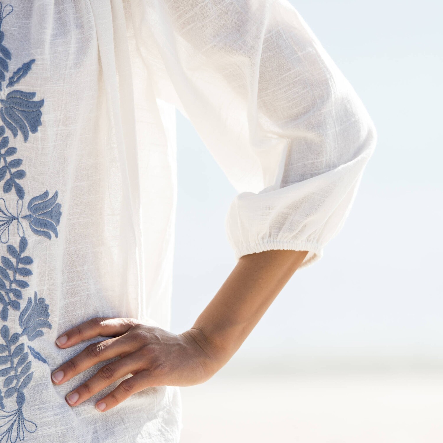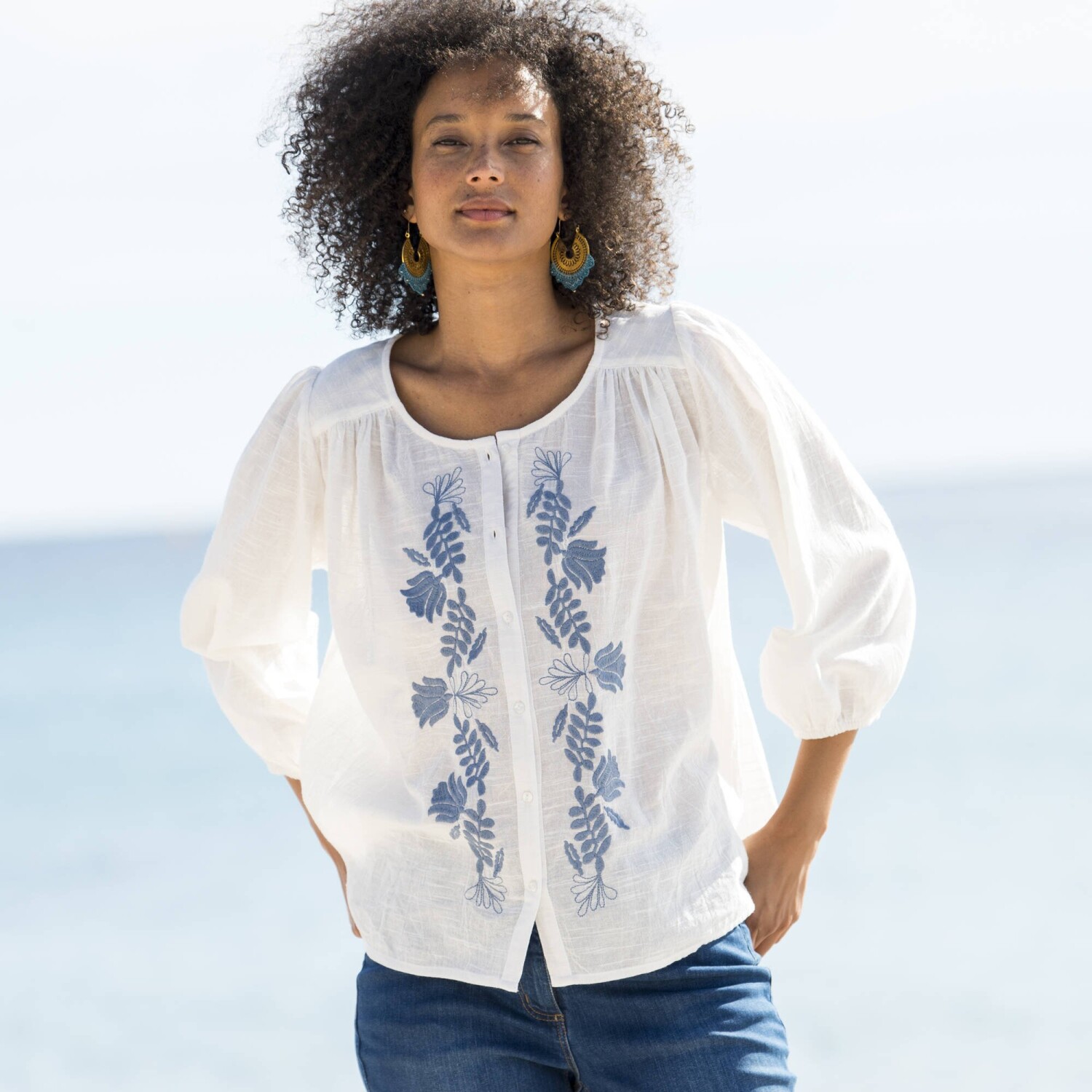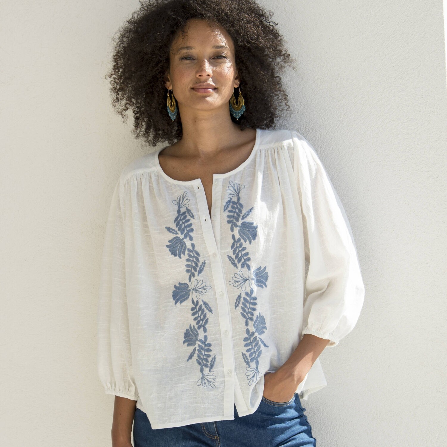 Styl boho jest również noszony w tym sezonie. Nie przegap więc haftowanej bluzki. Okrągły dekolt. Szerokie rękawy 3/4. Elastyczne mankiety. Marszczone szwy na ramionach z przodu i z tyłu. Marszczenia na ramionach. Perłowe guziki z przodu. Prosty dół. Można prać w pralce.