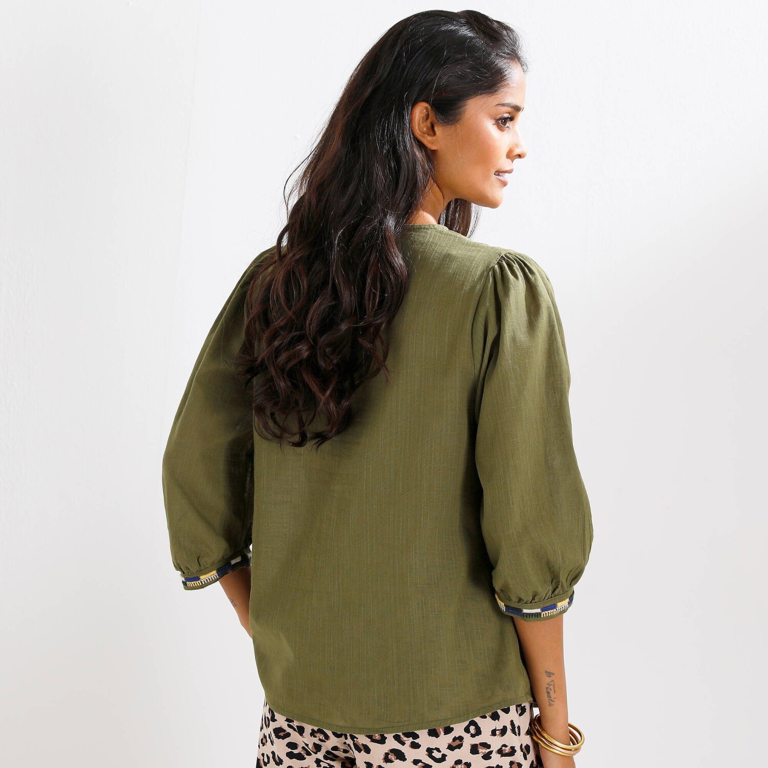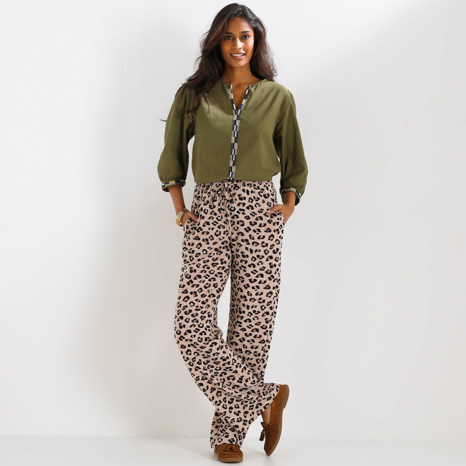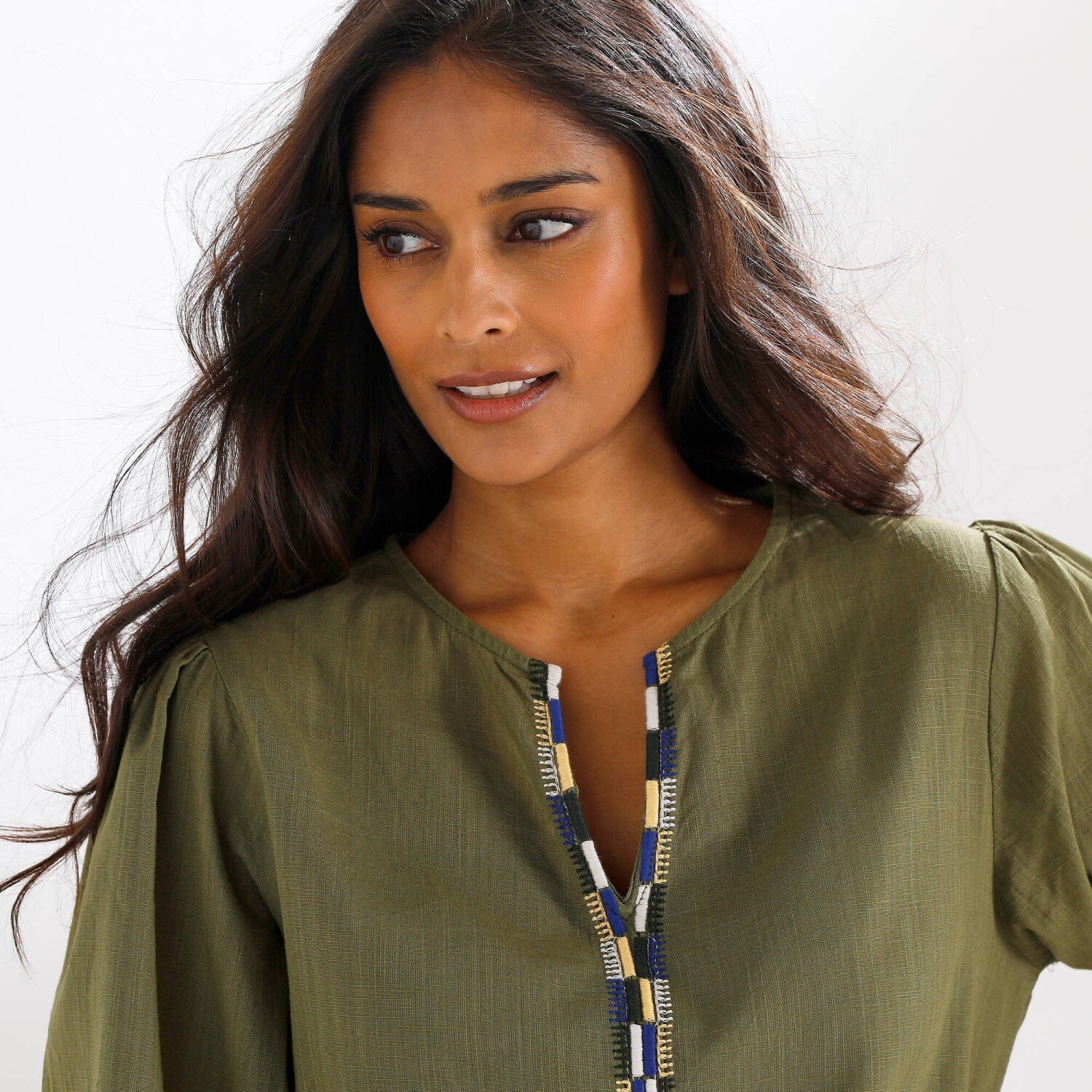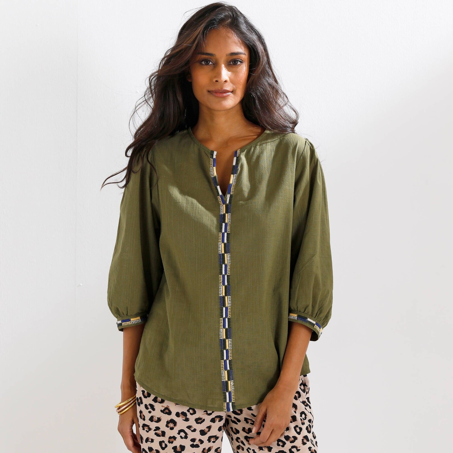 Ta miękka, zwiewna bluzka z łatwej w pielęgnacji tkaniny krepowej jest idealna na upalne dni.