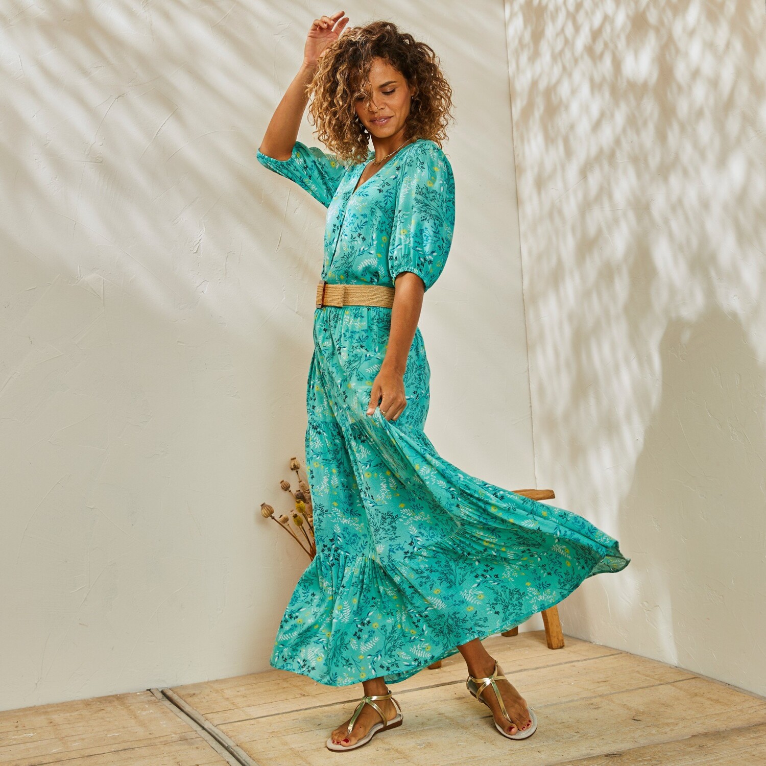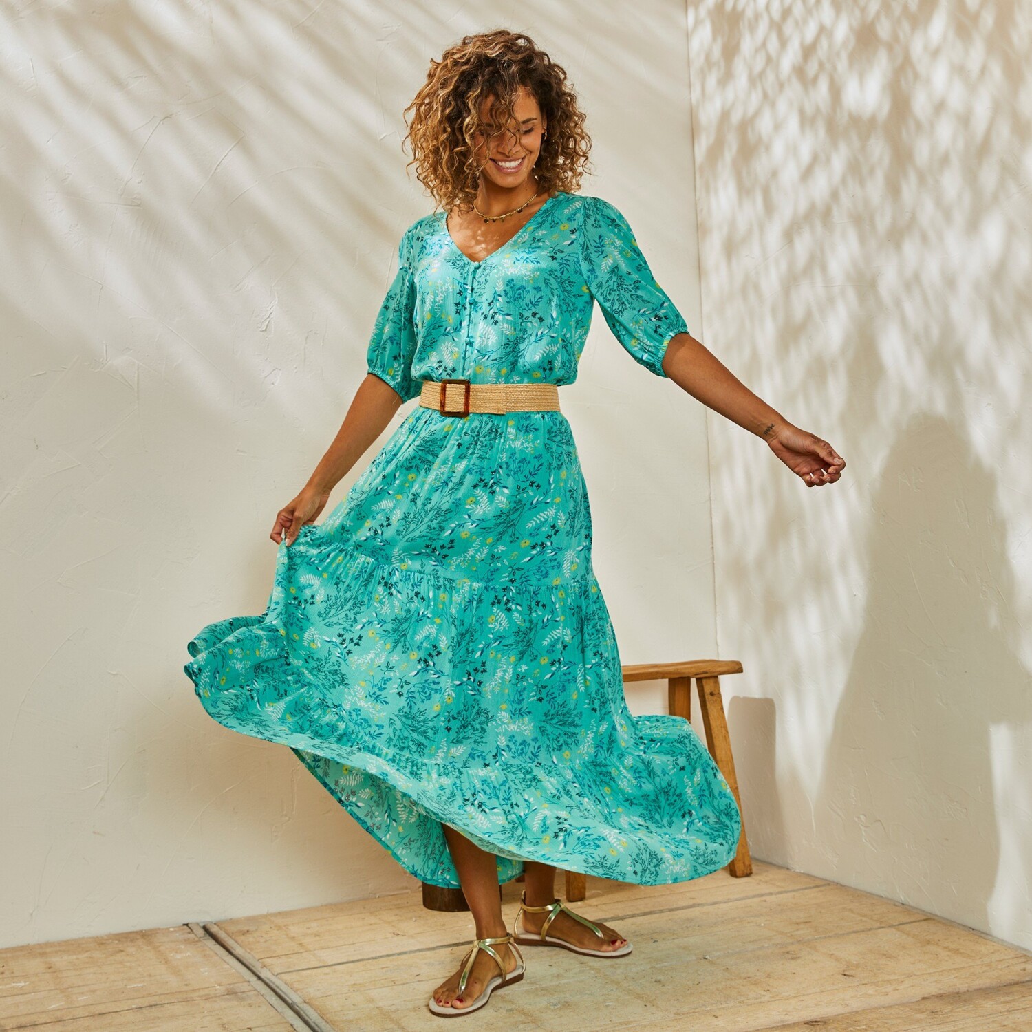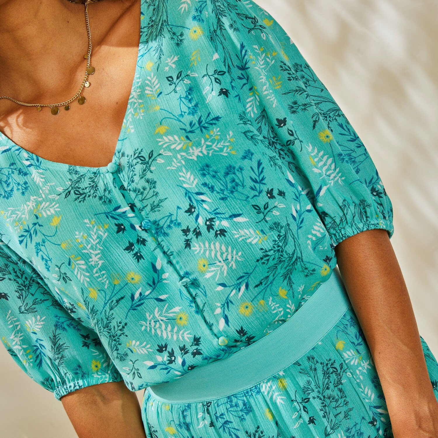 Wygląd boho i puszysta przewiewność: ta bluzka to jeden z niezbędnych elementów w tym sezonie! Luźny dekolt w kształcie litery V podkreśla dekolt. Zaszewki na piersi. Zapięcie z przodu na powlekane guziki. Elastyczne rękawy do łokcia. Zaokrąglony dół. Wykonany z lekkiego materiału. Można prać w pralce.