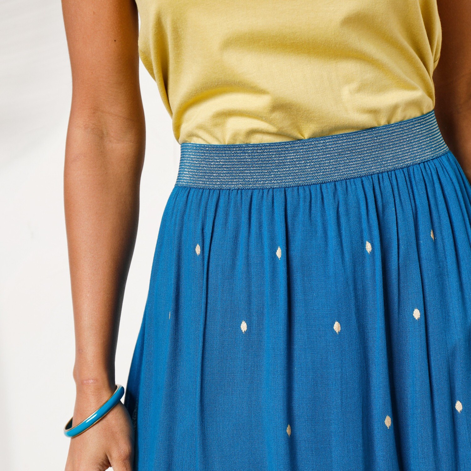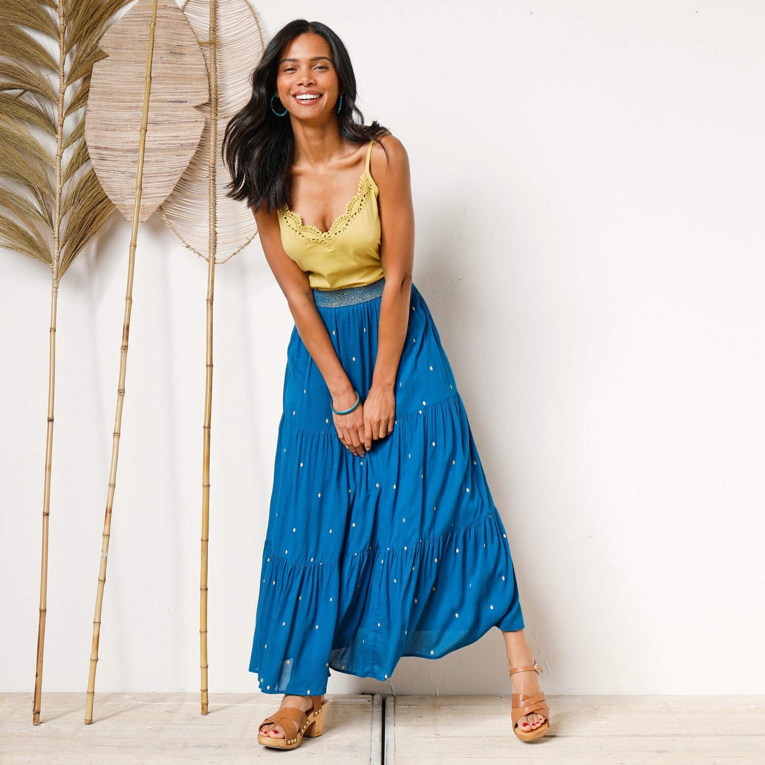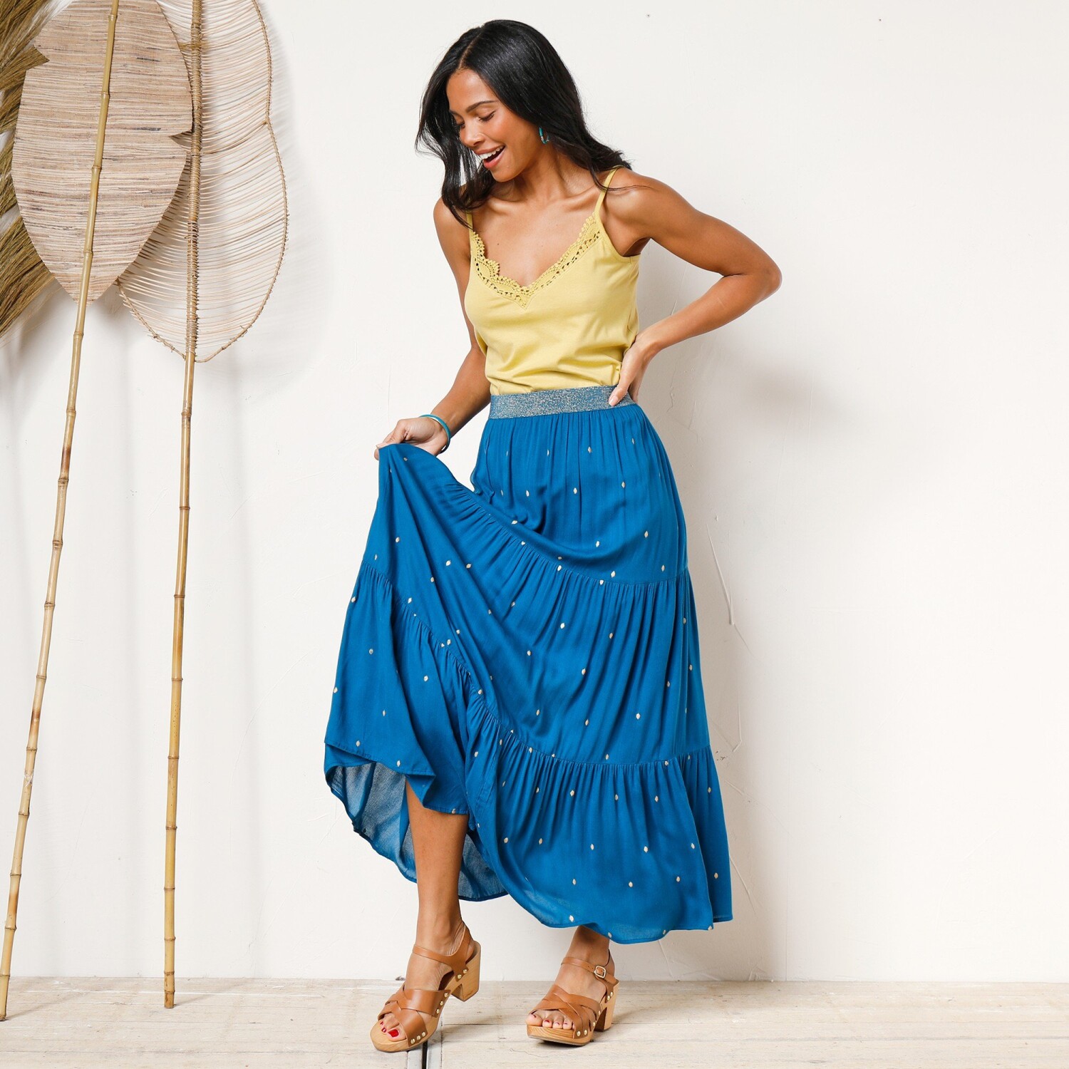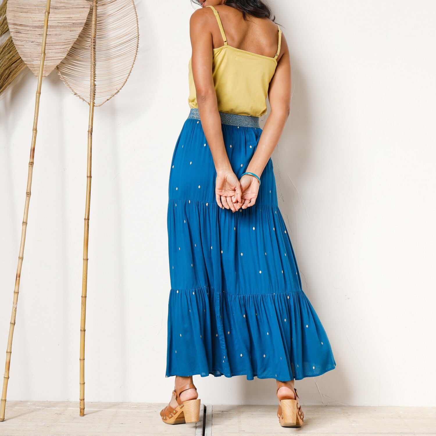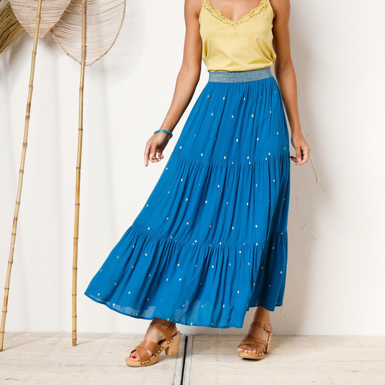 Błyszcząca spódnica z krepy ze złotym nadrukiem. Długość poniżej kolan. Niezwykle wygodny, złoty pasek w talii. 3 lekko marszczone falbany. Podszewka. Można prać w pralce.