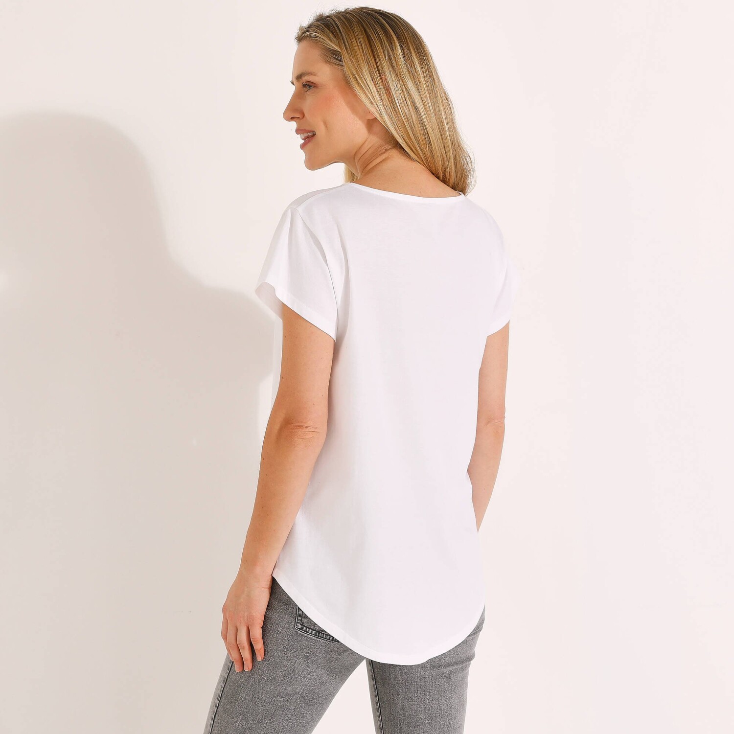 Wygodna koszulka z krótkim rękawem wykonana z bawełnianego dżerseju z certyfikatem Oeko-Tex. Okrągły, luźny dekolt. Krótkie rękawy. Lekko opadające ramiona. Zaokrąglony dół. Oddychająca koszulka, która jest wygodna w noszeniu. Standard 100 według Oeko-Tex (nr CQ 1216 / 3-IFTH). Ten znak identyfikuje produkty tekstylne, które zostały poddane testom laboratoryjnym pod kątem szerokiej gamy szkodliwych substancji, a produkt jest bezpieczny poza obecnymi standardami. Można prać w pralce.