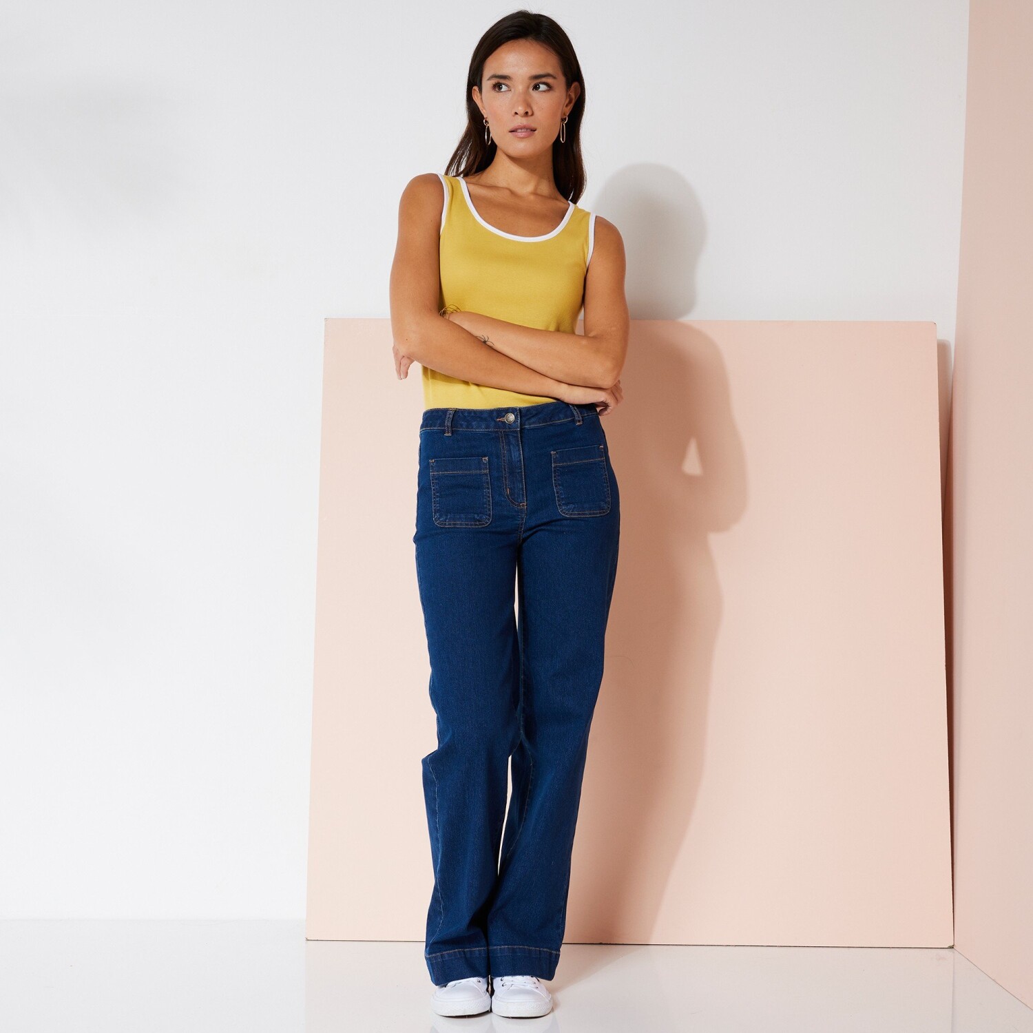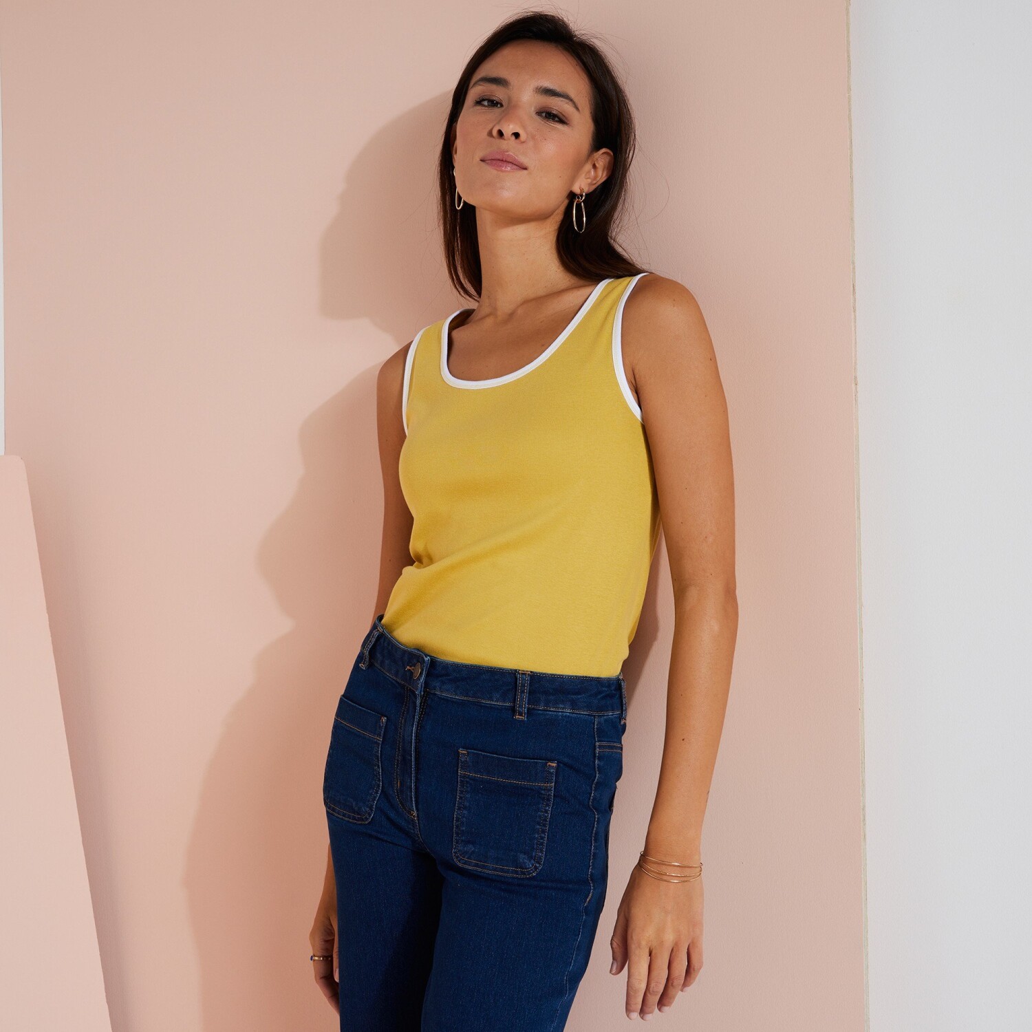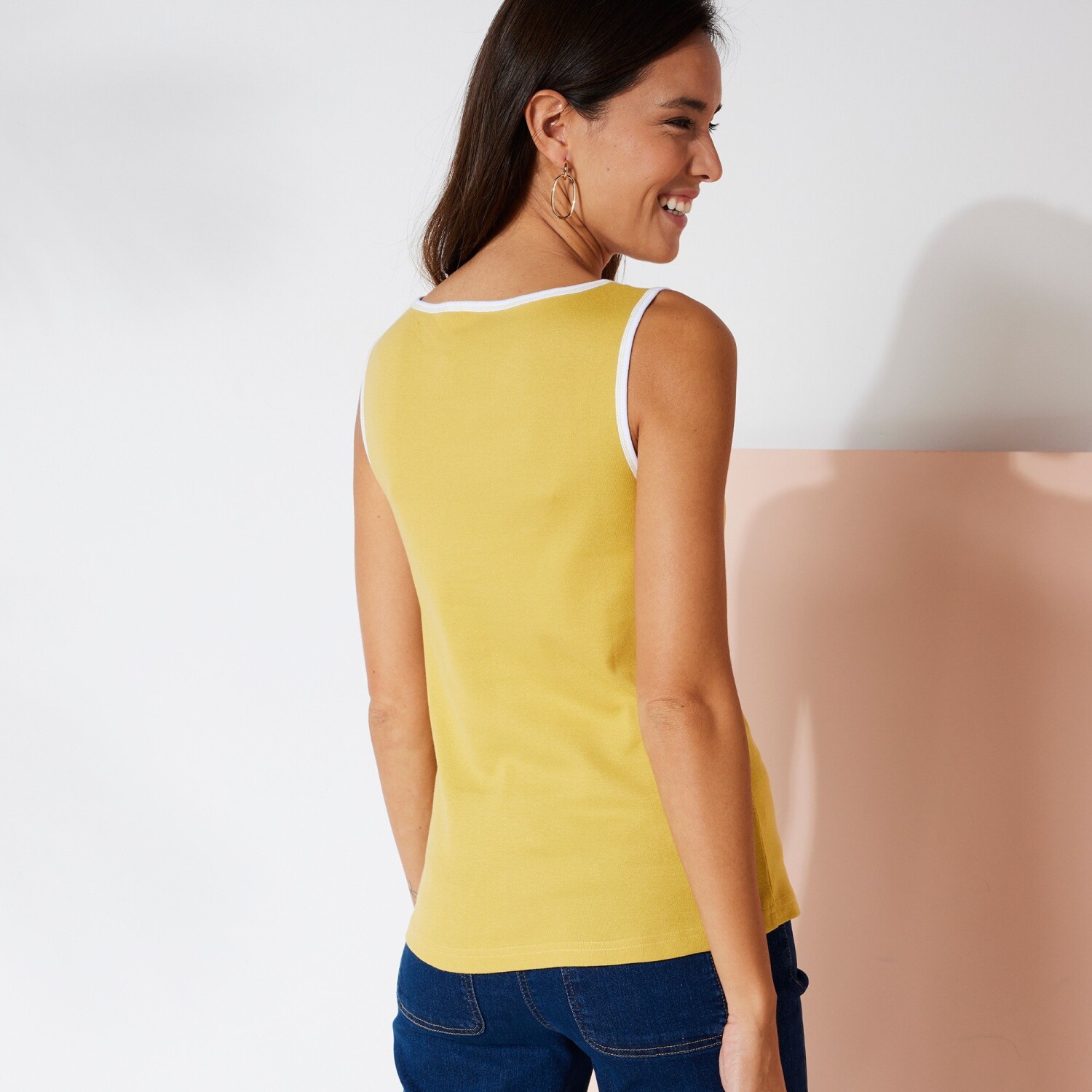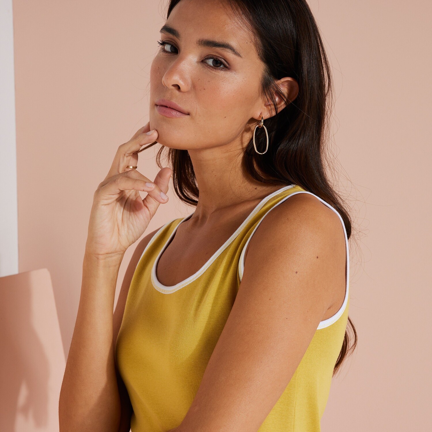 Niezbędny element letniej garderoby to dwukolorowy top z certyfikowanej bawełny. Okrągły dekolt. Bez rękawów. Kontrastowy dekolt i otwory na ręce. Prosty dół. Oeko-Tex standard 100 (nr CQ 1216 / 3 IFTH). Ten znak identyfikuje produkty tekstylne, które zostały poddane testom laboratoryjnym pod kątem szerokiej gamy szkodliwych substancji, a produkt jest bezpieczny poza obowiązującymi normami. Można prać w pralce.