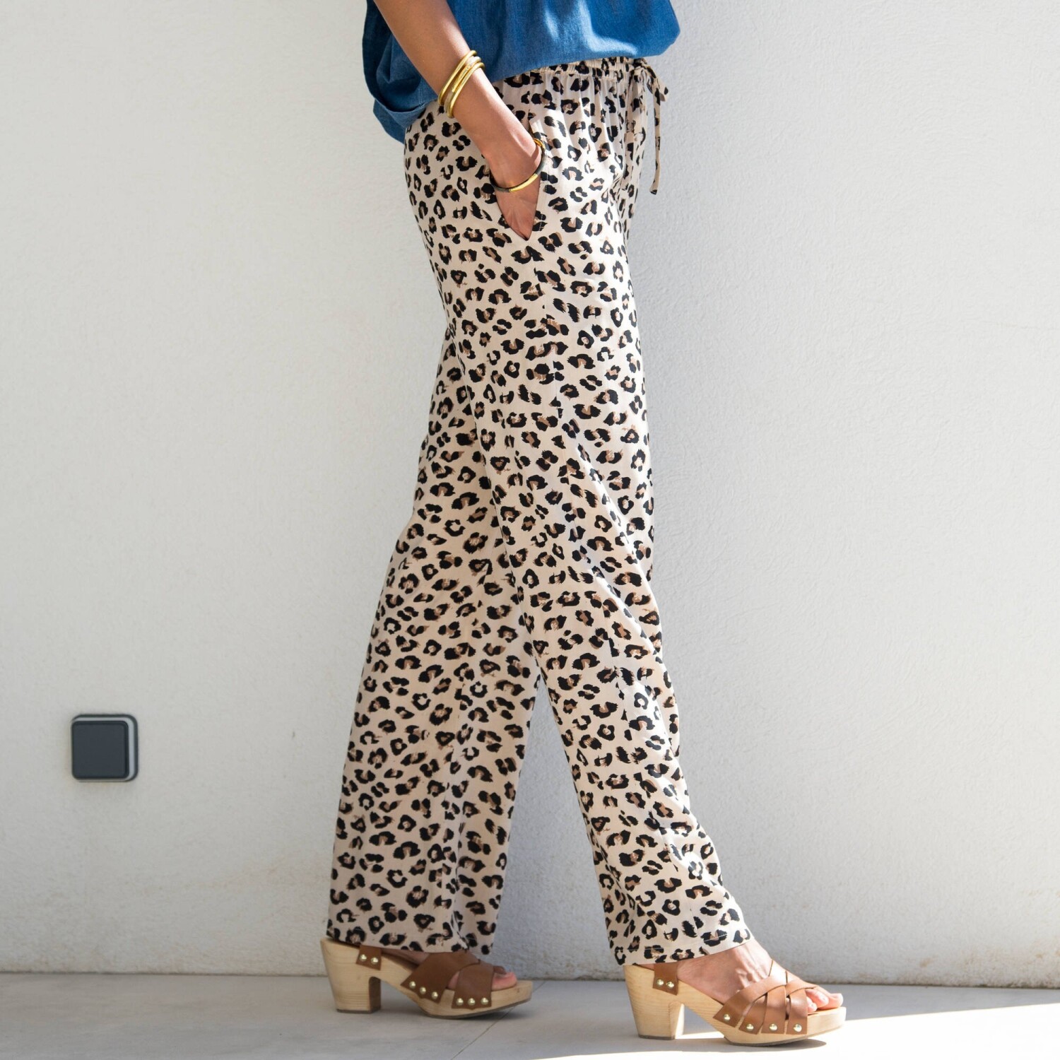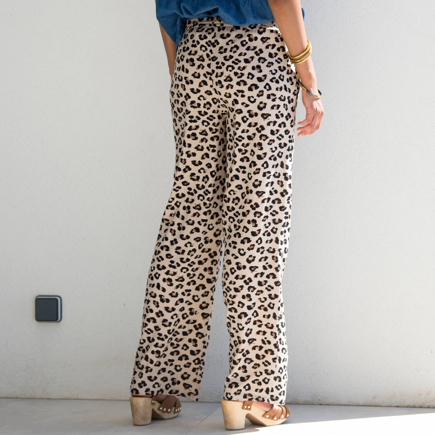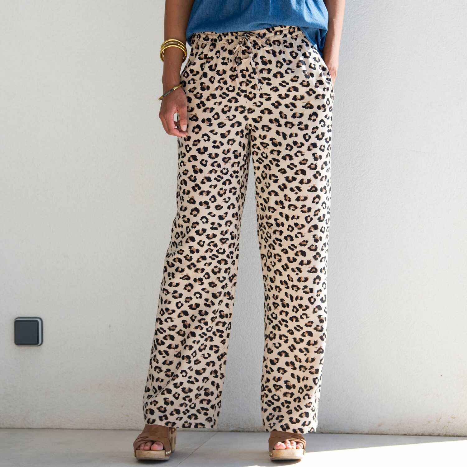 Po co wybierać między modą a wygodą? Przewiewne spodnie z wysokim stanem w lamparcie cętki spełniają obie te funkcje. Szeroki krój. Przewiewna dzianina. Elastyczny pas ze sznurkiem. 2 kieszenie w szwach bocznych. Wykończone obszyciem. Można prać w pralce.