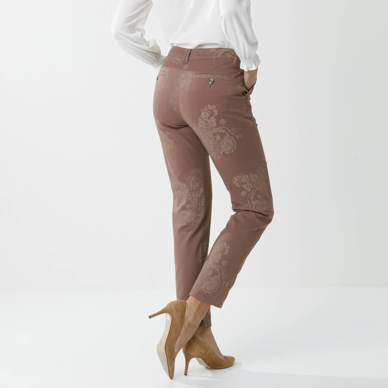Wykonane z elastycznego materiału, spodnie te wyszczuplają pośladki i modelują uda! Standardowy stan. Elastyczna talia z tyłu po bokach od rozmiaru 44. Podwyższona część z tyłu. Zapięcie na zamek błyskawiczny i guzik. 2 kieszenie z przodu. 2 haftowane kieszenie z tyłu. Wykonane z elastycznego materiału zapewniającego swobodę ruchów. Standard 100 według Oeko-Tex (CQ 1216/3 IFTH). Ten znak oznacza produkty tekstylne poddane testom laboratoryjnym na obecność szerokiej gamy substancji szkodliwych, a produkt jest bezpieczny w użyciu, wykraczając poza obowiązujące normy. Można prać w pralce.