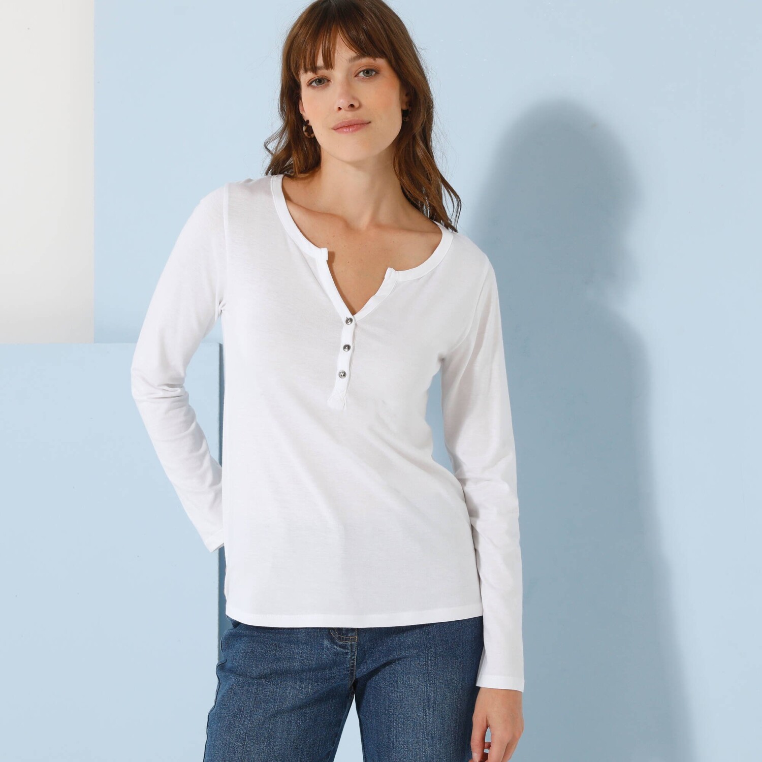 Faliste makramy zdobią dekolt tej modnej koszulki. Dekolt w kształcie litery V z makramą. Krótkie rękawy. Opuszczone rękawy z makramowym wykończeniem. Prosty dół. Oddychająca, łatwa w pielęgnacji dzianina. Można prać w pralce.