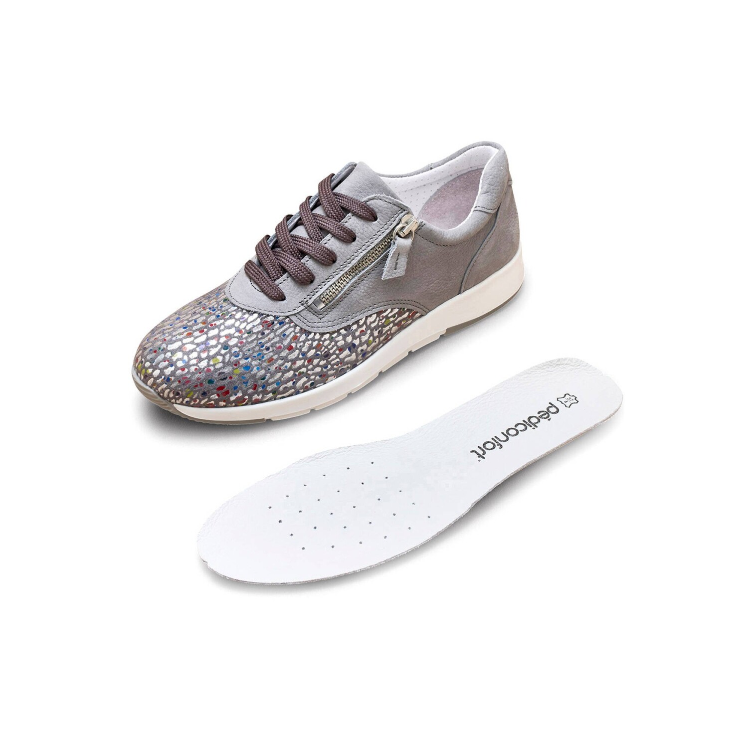 Idealna szerokość i modny wygląd: derby Pédiconfort są niezwykle wygodne i odpowiednie dla szerszych stóp i haluksów. Sznurowane, zapinane na zamek, wyjątkowo miękkie, dopasowują się do Twojego stylu. Cholewka z 2 materiałów: eleganckie połączenie wzorzystej skóry i materiału tekstylnego z nadrukiem zwierzęcego futra. Wyjmowana miękka wkładka (aérosemelle). Elastyczny komfort: wrażliwe obszary z elastycznego materiału tekstylnego odpowiednie dla haluksów. Sznurowadła do wiązania. Zamek błyskawiczny do łatwego i szybkiego zakładania. Dostosowane do szerszych stóp. Kontrastowa modna podeszwa. Nie jest to obuwie medyczne.