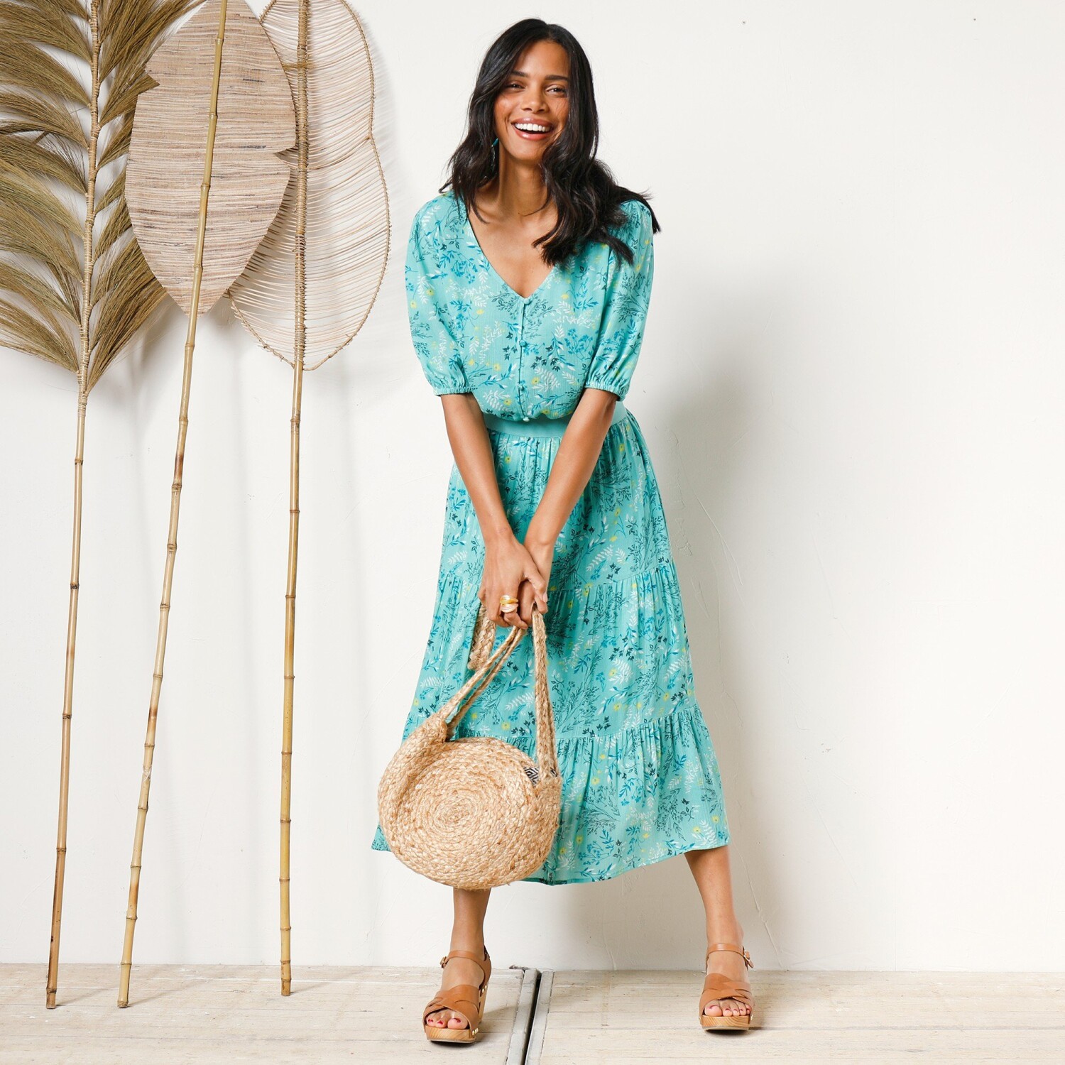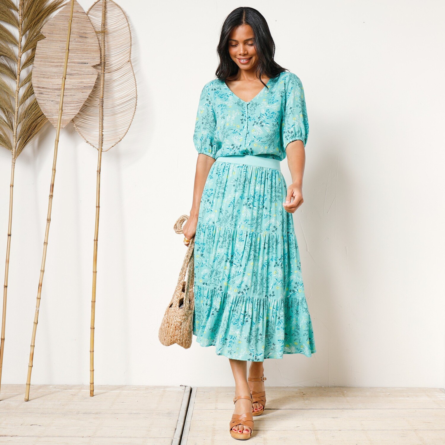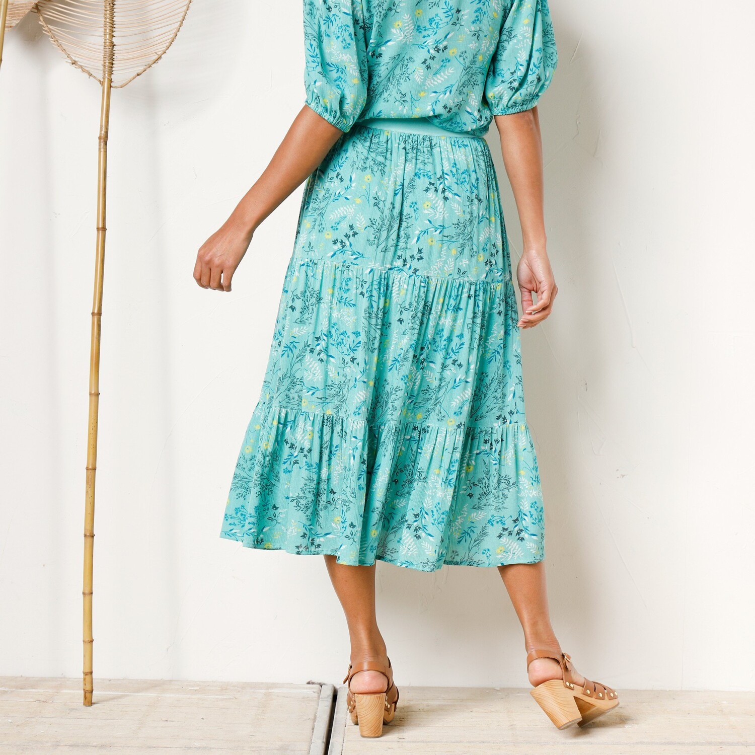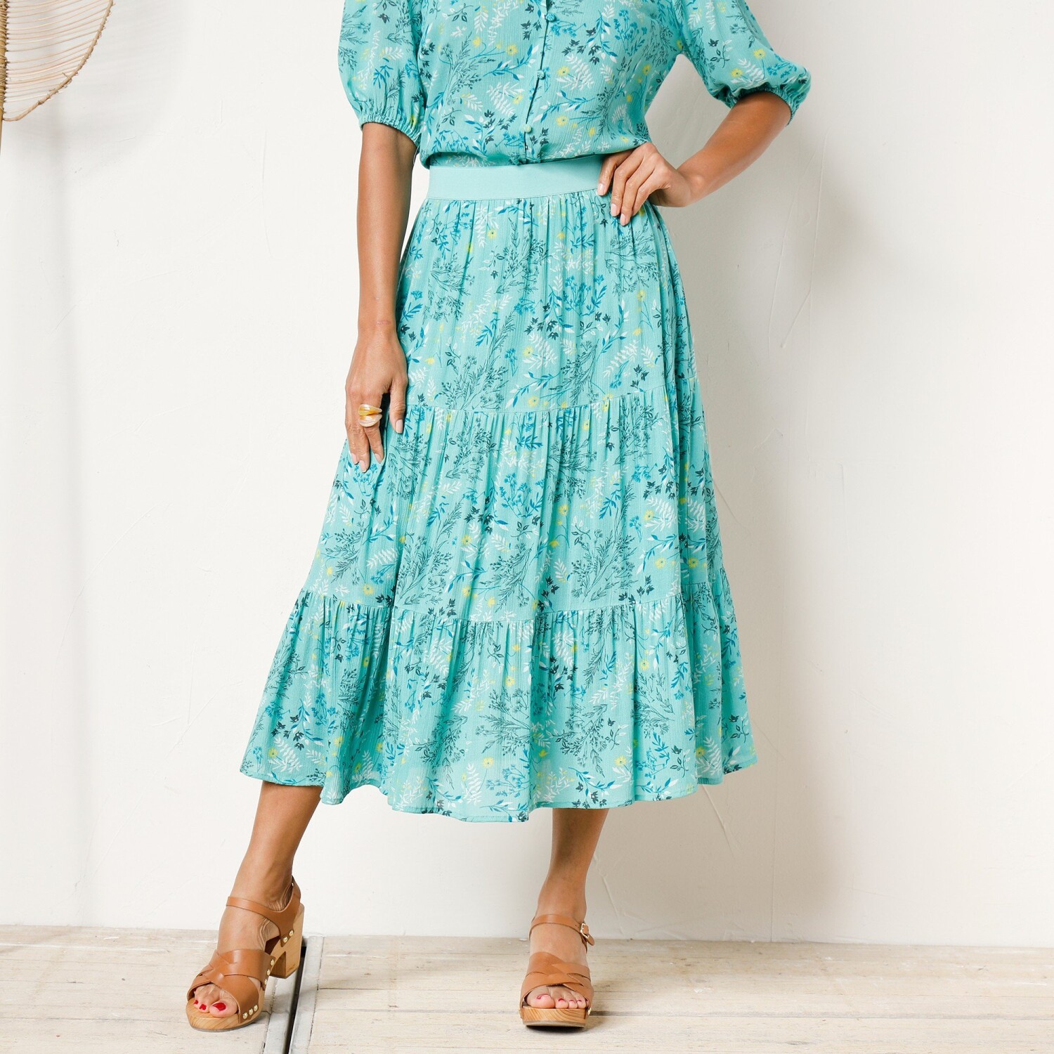 Ta półdługa spódnica z falbanami i nadrukiem rozjaśni każdy dzień! Wykonana z lekkiej krepy, idealna na letnią pogodę. Długość do połowy łydki. Elastyczny, wygodny pas. 3 falbany. Podszewka. Można prać w pralce.