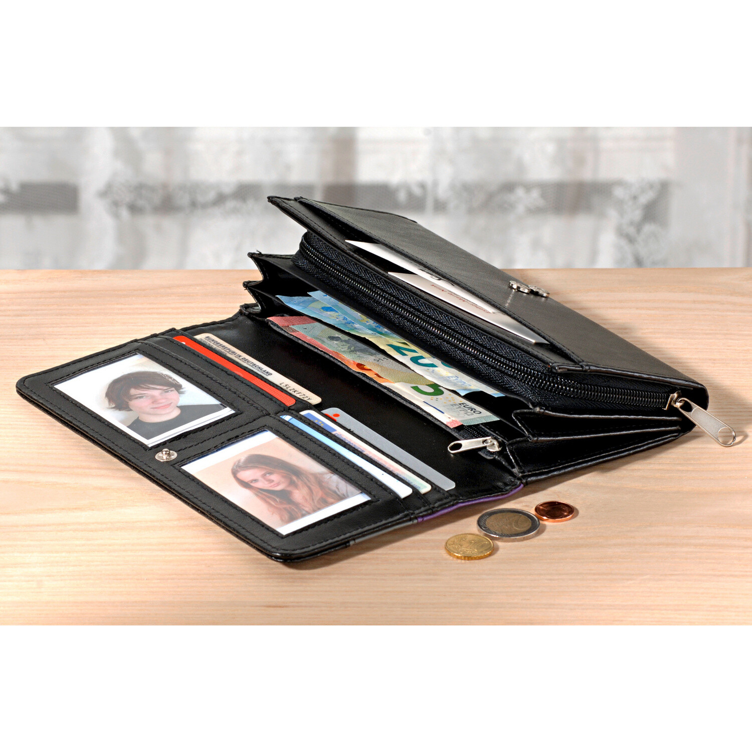Super praktyczna! Ten podwójny portfel z wieloma przegródkami na karty i banknoty można oddzielić od kieszeni na monety i używać osobno, w zależności od potrzeb. Z ochroną danych RFID. Portfel na karty płatnicze z kieszenią na monety. Odpinana kieszeń na monety. Do użytku razem lub osobno. Z paskiem na nadgarstek. Ochrona danych w ramach RFID. 2 kolory.