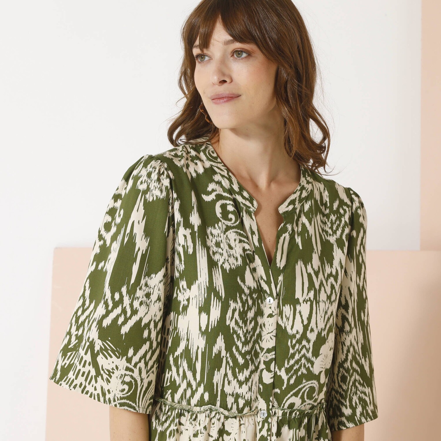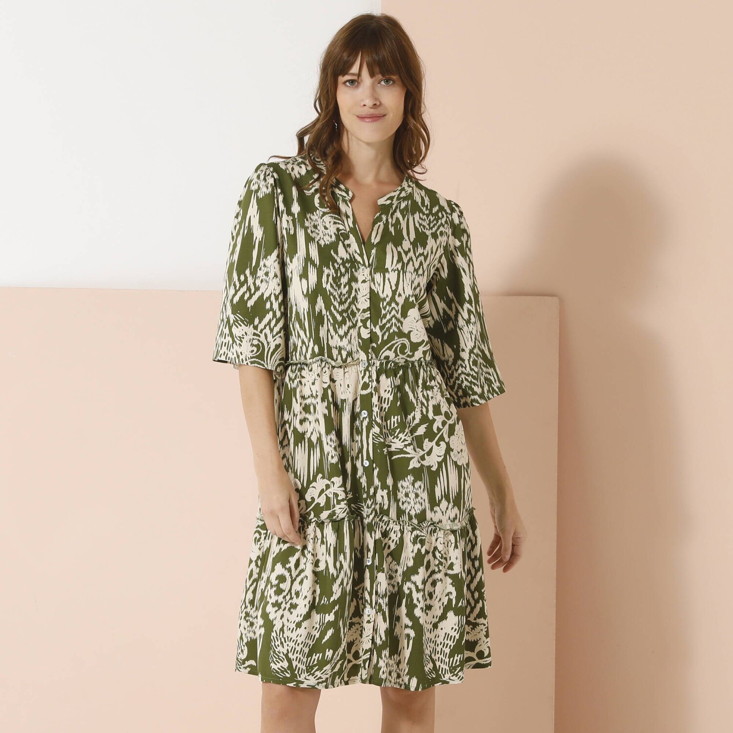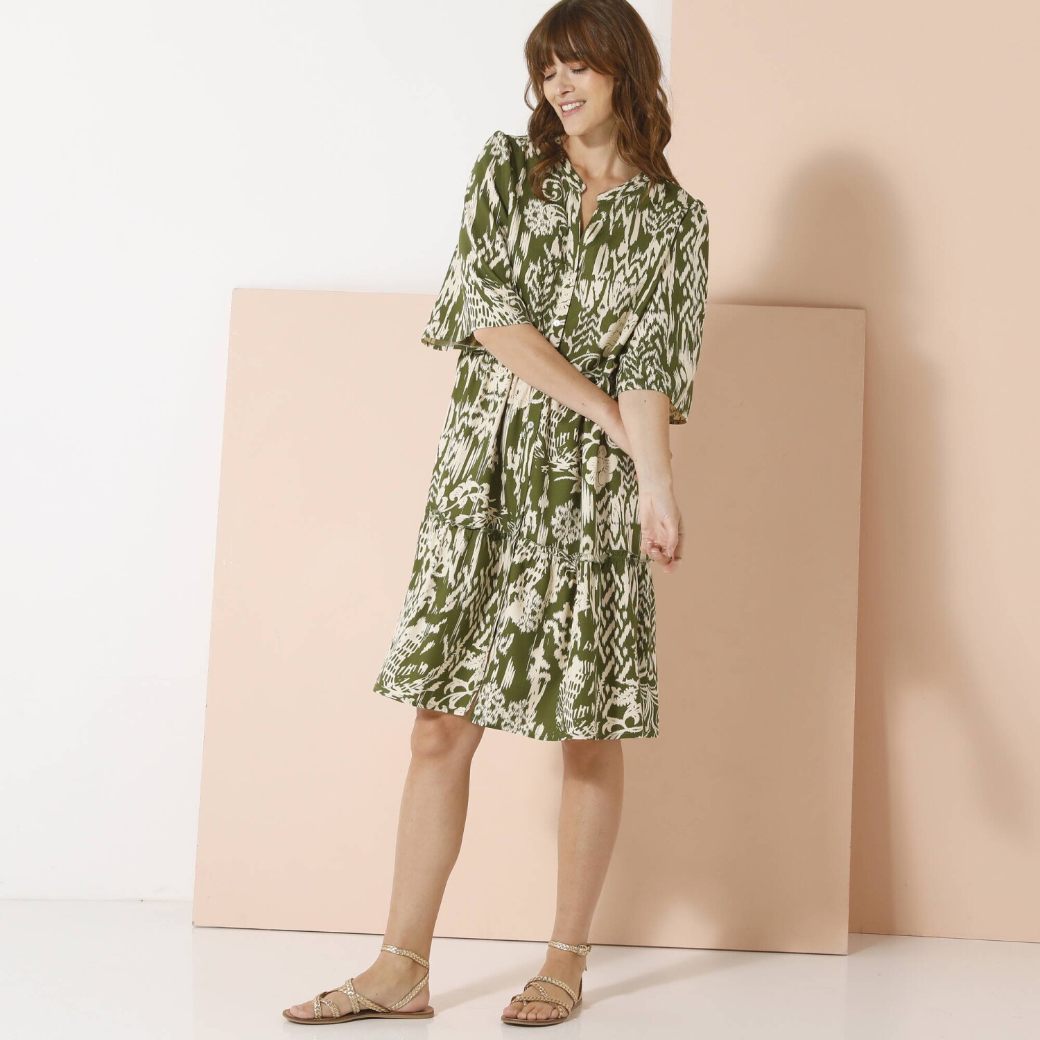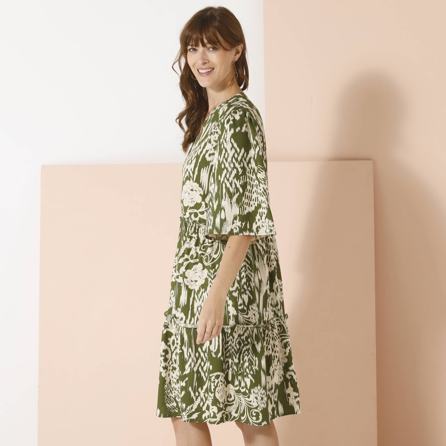 Rozkloszowana sukienka z falbanami i etnicznym dwukolorowym wzorem to bezpieczny wybór. Dekolt tuniki i zapięcie na guziki w talii. Rękawy 3/4. Rozkloszowany dół z falbanami. Długość przed kolano. Dwukolorowy etniczny nadruk. Można prać w pralce.