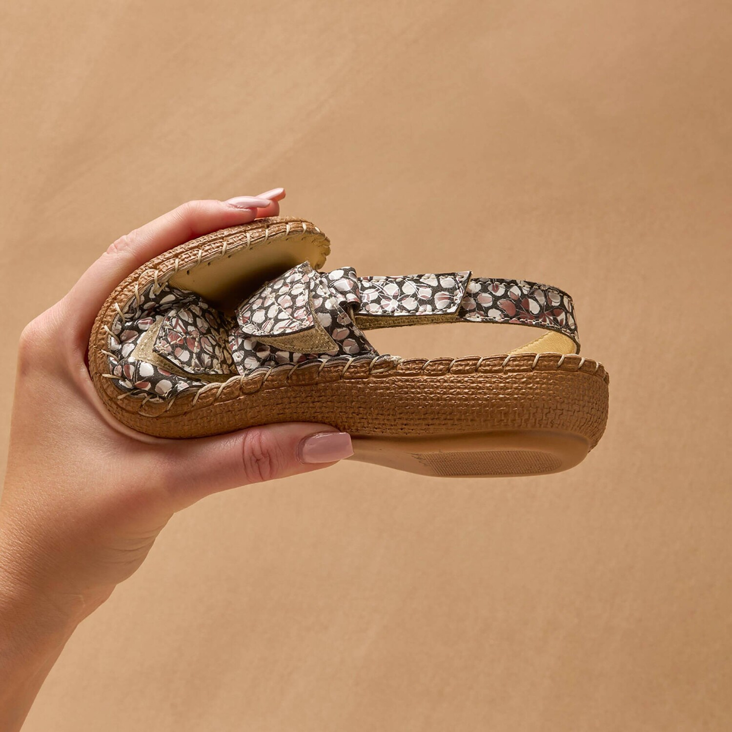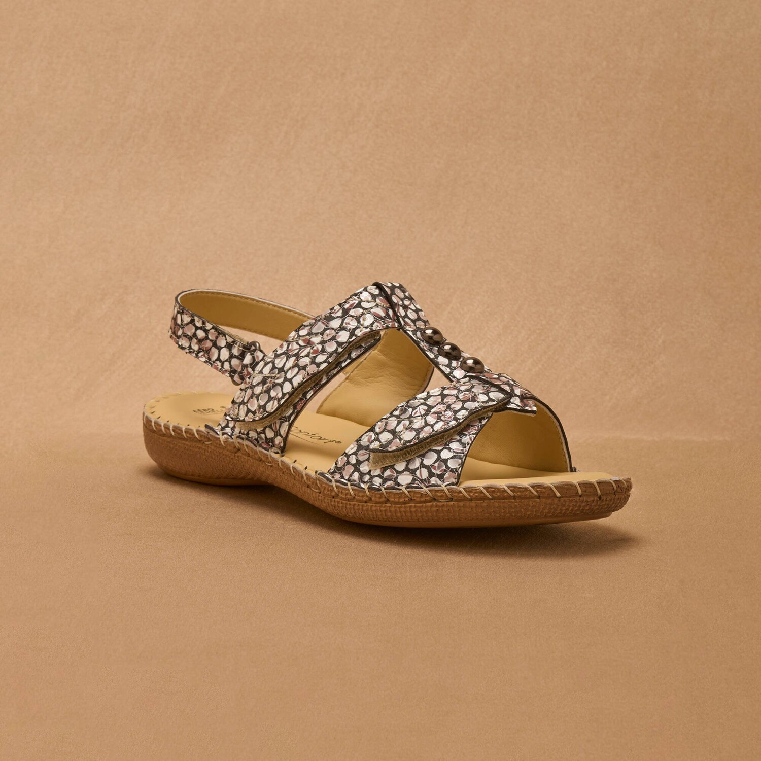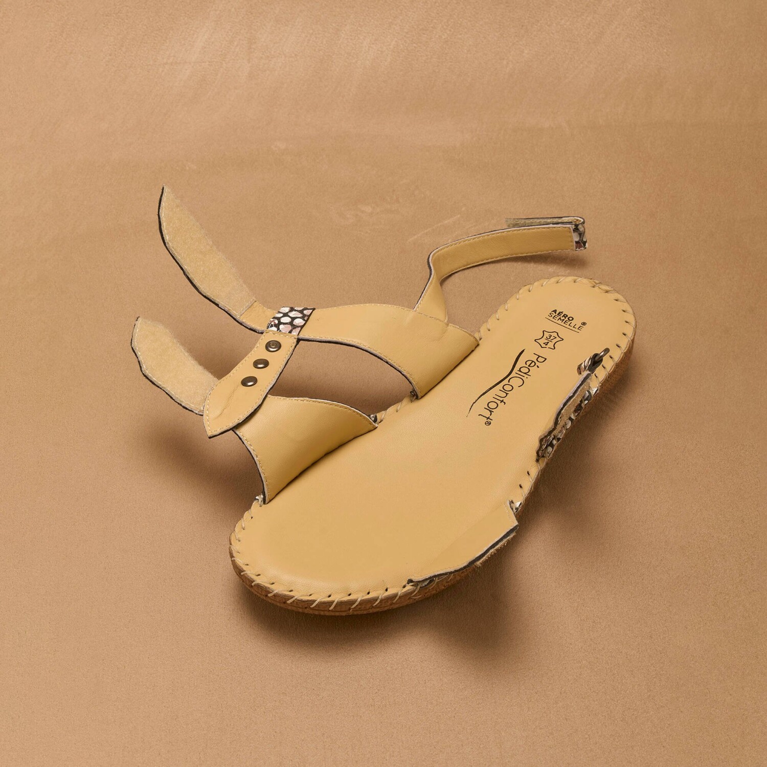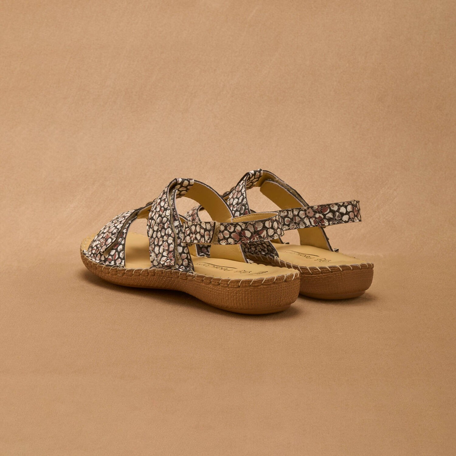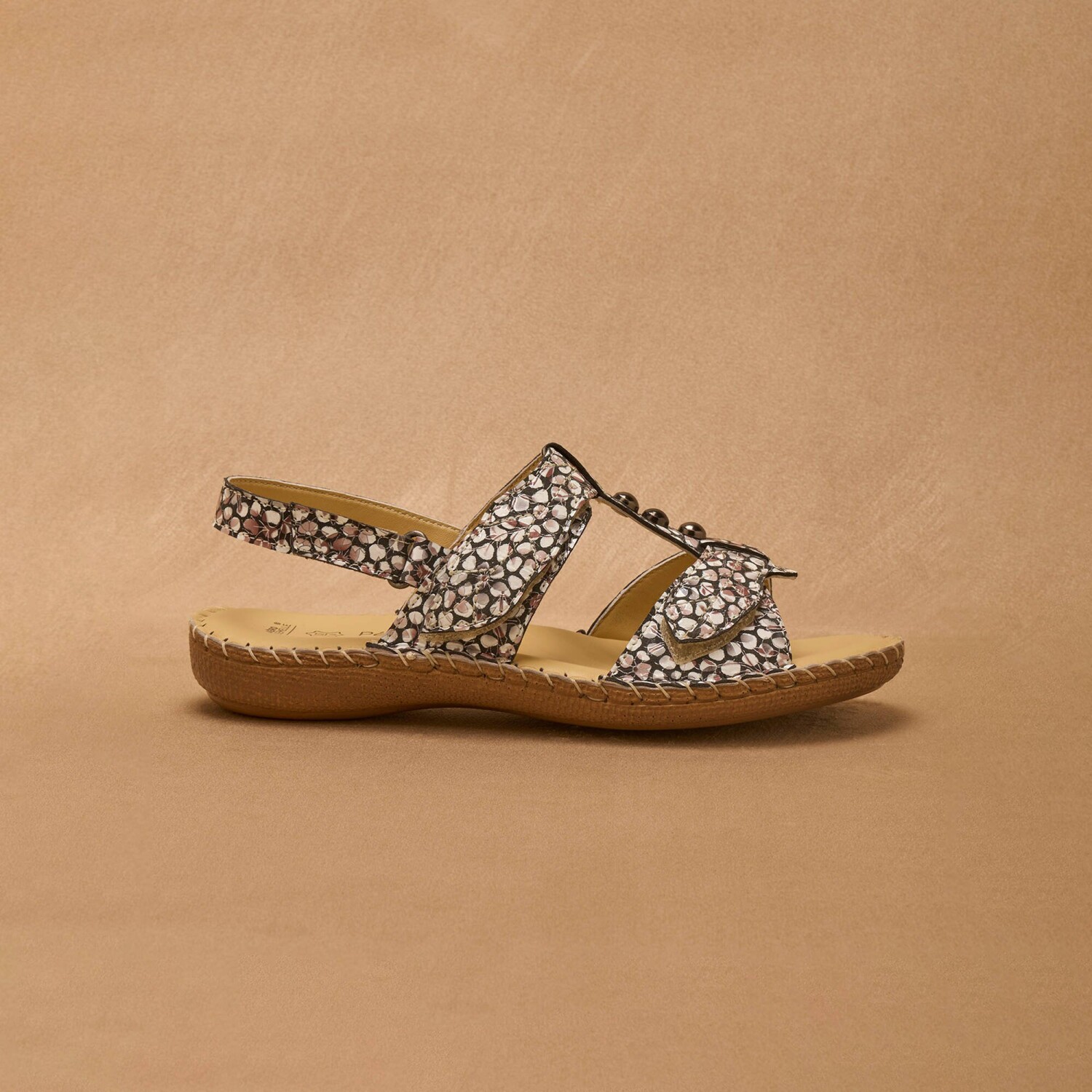 Skórzane sandały można rozpiąć w całości, aby łatwo dopasować je do każdej szerokości stopy. 3 paski na rzepy: 2 w kształcie liścia z przodu i 1 z tyłu. Łatwe do zakładania. 3 metaliczne ozdoby bijou.