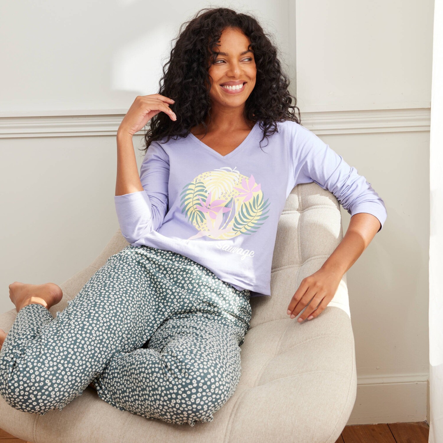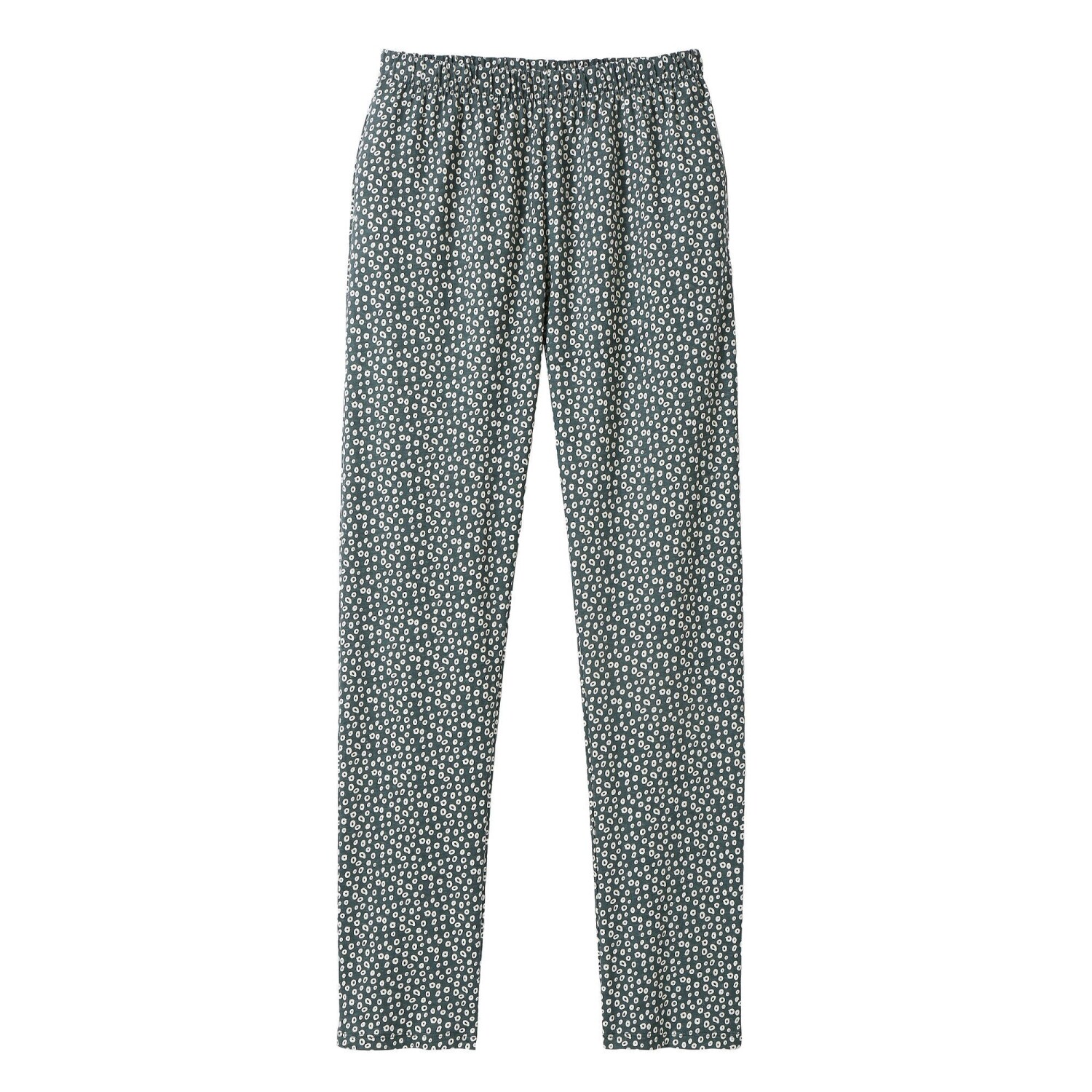 Spodnie piżamowe z nadrukiem roślinnym są miękkie i wygodne. Prosty, wygodny krój. Kieszenie klinowe. Minimalistyczny nadruk roślinny. Płaski przód, gumka w pasie z tyłu.