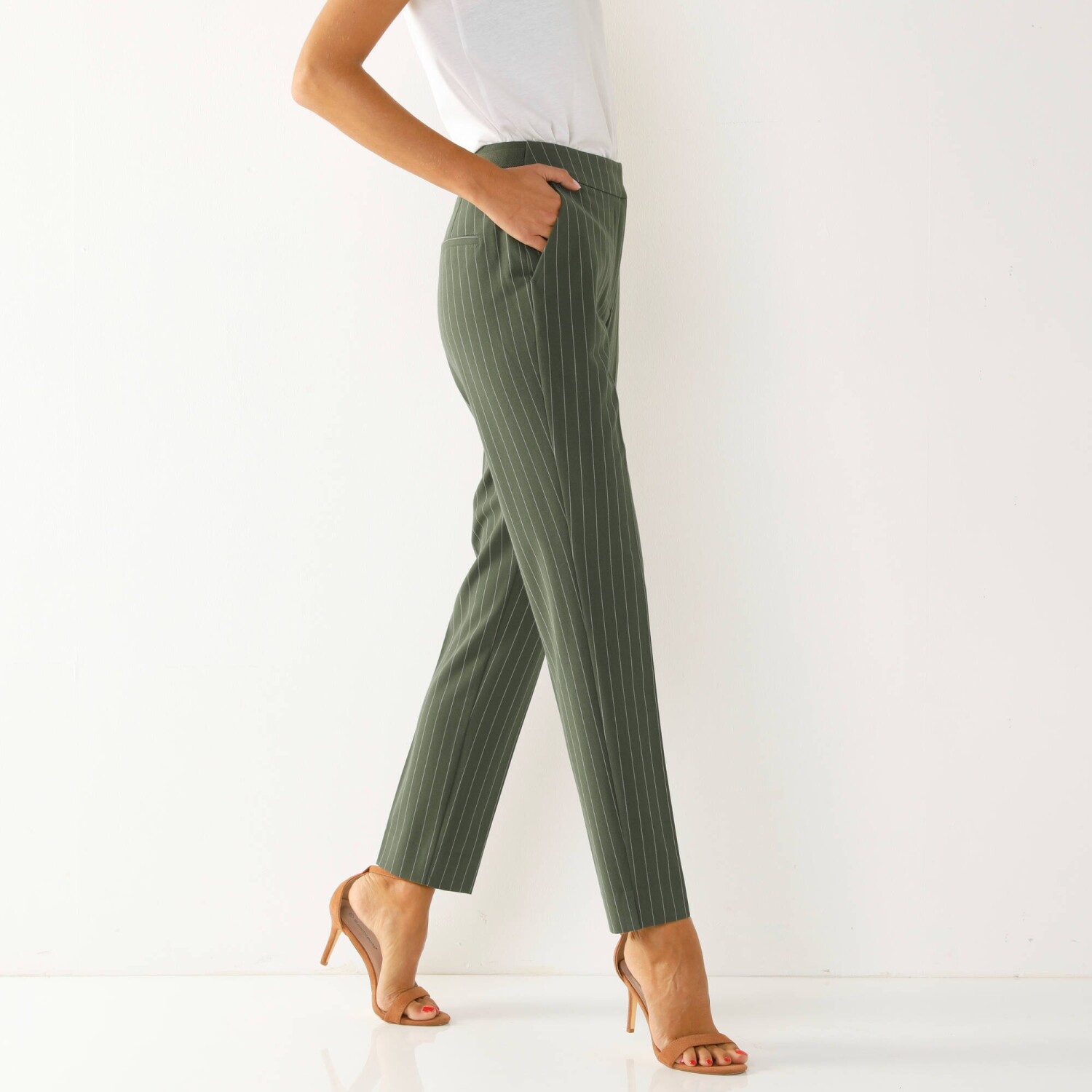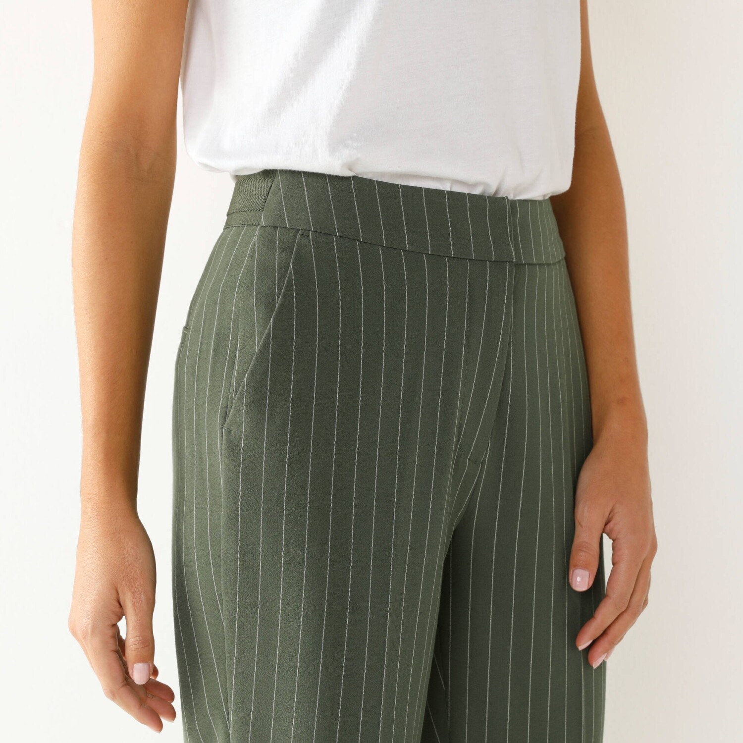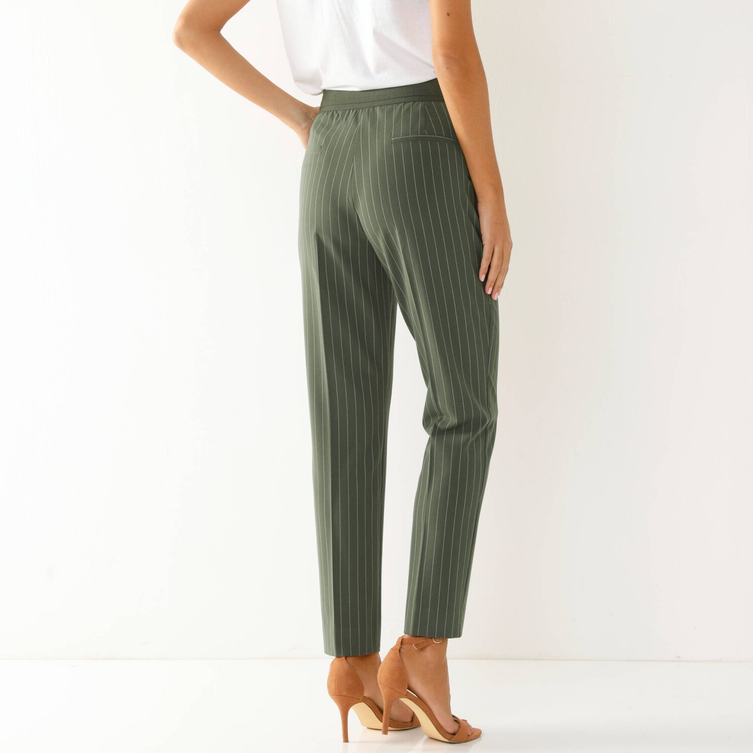 Spodnie skinny 7/8 w paski optycznie wydłużają sylwetkę. Wysoki stan. Krój cygaretek: proste w udach, dopasowane w kostkach. Długość 7/8 wydłuża sylwetkę. Płaski pasek z przodu, gumka z tyłu. Zapięcie na suwak, haftkę i wewnętrzny guzik. 2 klinowe kieszenie z przodu. 2 naszywane kieszenie z tyłu. 2 sztuczne kieszenie ze ściągaczem z tyłu. Rozcięcia na końcach nogawek. Guziki. Można prać w pralce.