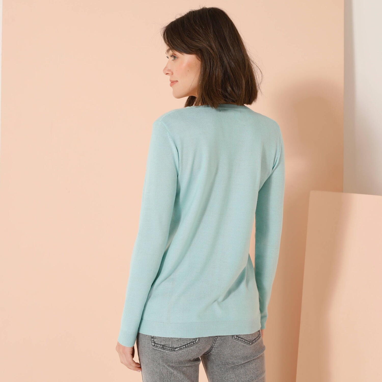 Okrągły sweter z miękkiej w dotyku dzianiny przekonał nas do siebie. Prosty krój ułatwiający utrzymanie. Okrągły dekolt. Długie rękawy. Prosty dół. Można prać w pralce.