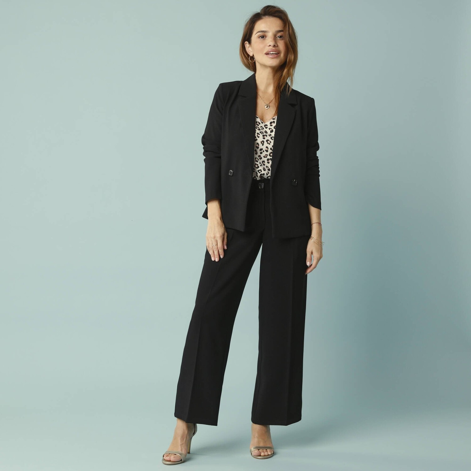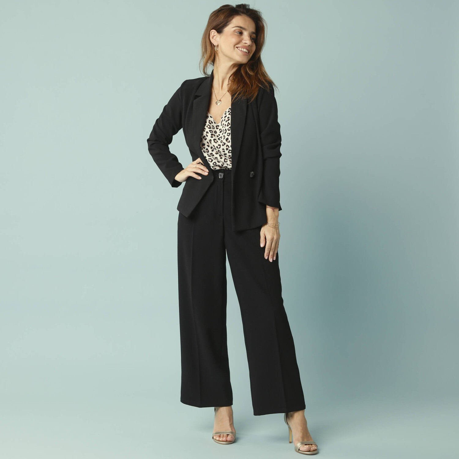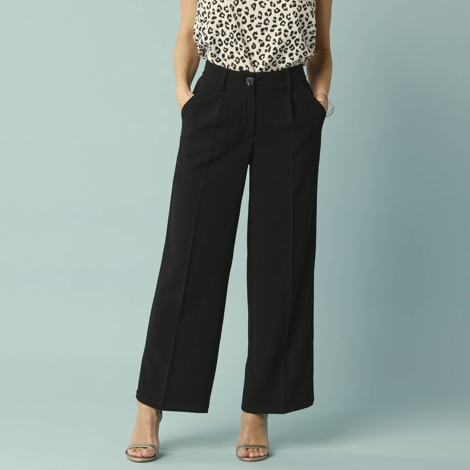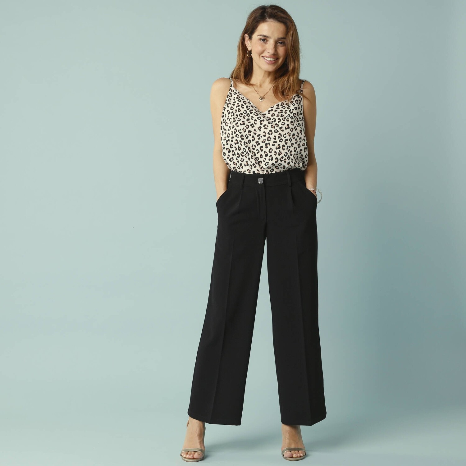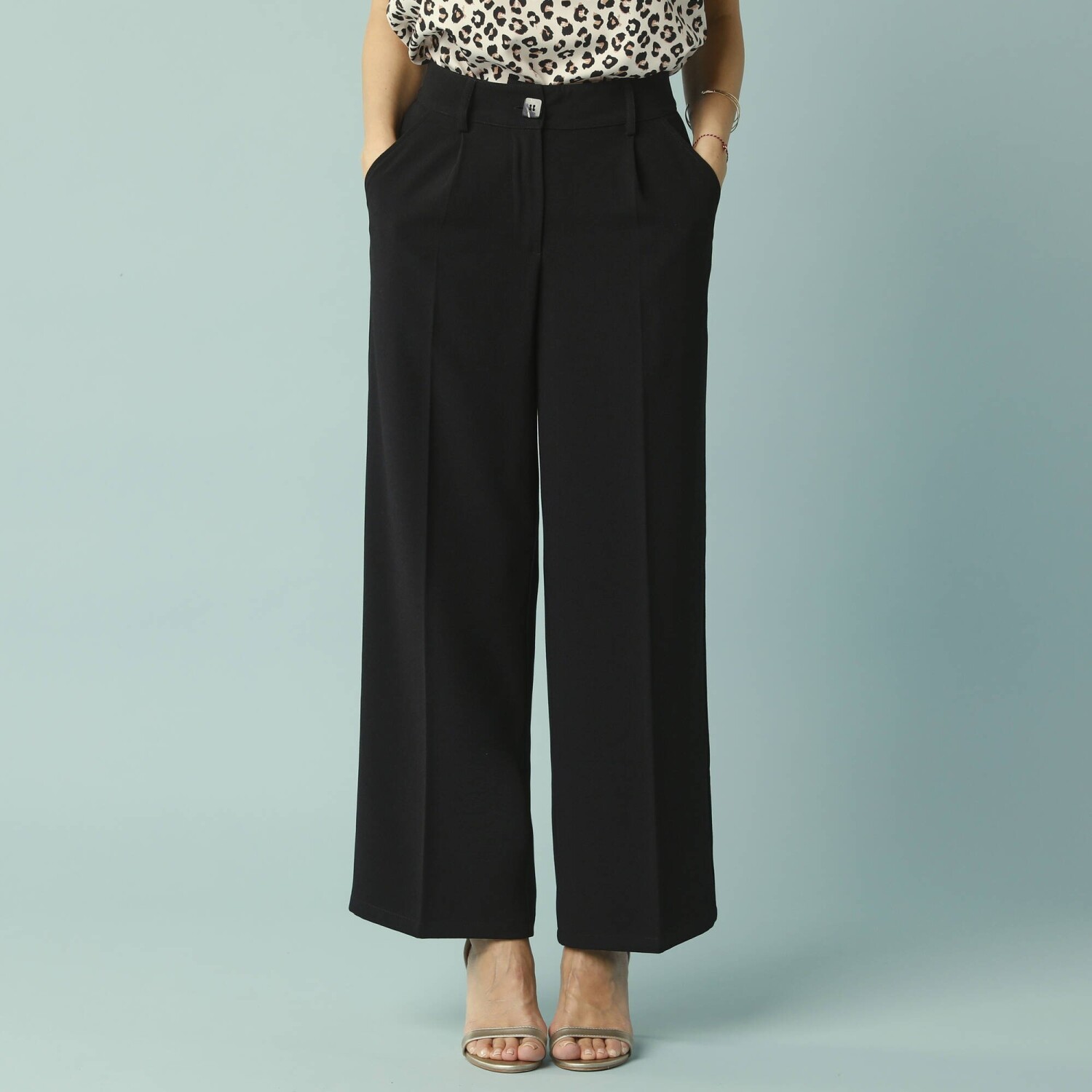 Szerokie spodnie z wysokim stanem są proporcjonalnie zaprojektowane dla drobnych kobiet. Idealny dla osób o wzroście 150-160 cm. Przyjemny w dotyku materiał. Szeroki krój, standardowa wysokość talii. Profilowana talia z szlufkami. Zapięcie na zamek błyskawiczny i guzik. 2 zakładki + 2 przednie kieszenie wpuszczane. Zaszewki z tyłu. Krążki. Wykończone obszyciem. Można prać w pralce.